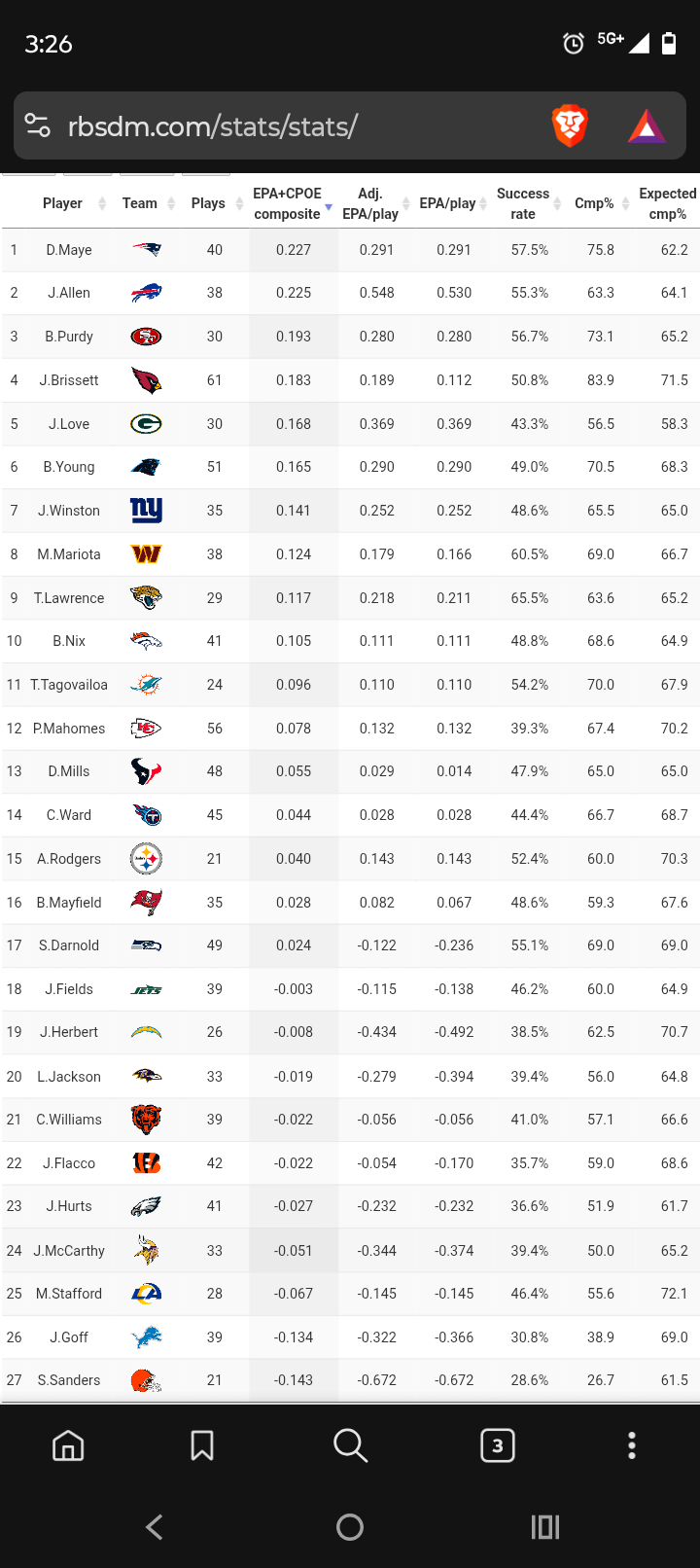 ha- you are cherry picking stats. Ward is ranked #33, dead last in all NFL QBS ranked for QBR and he is ranked #33 for RTG also. His 58.4% rate also gets him ranked at 33. Only stat that looks somewhat ok is his passing yardage which is largely bc of all the garbage time stat padding. I read that figure was 40% of his yardage was when down by at least 14. NO BUENO