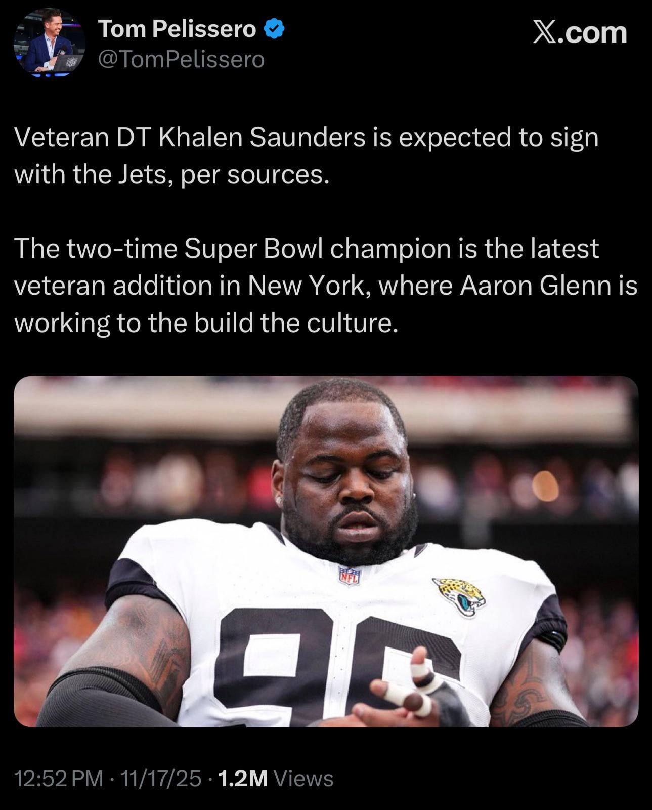 [Peliserro] Veteran DT Khalen Saunders is expected to sign with the Jets, per sources. The two-time Super Bowl champion is the latest veteran addition in New York, where Aaron Glenn is working to the build the culture.