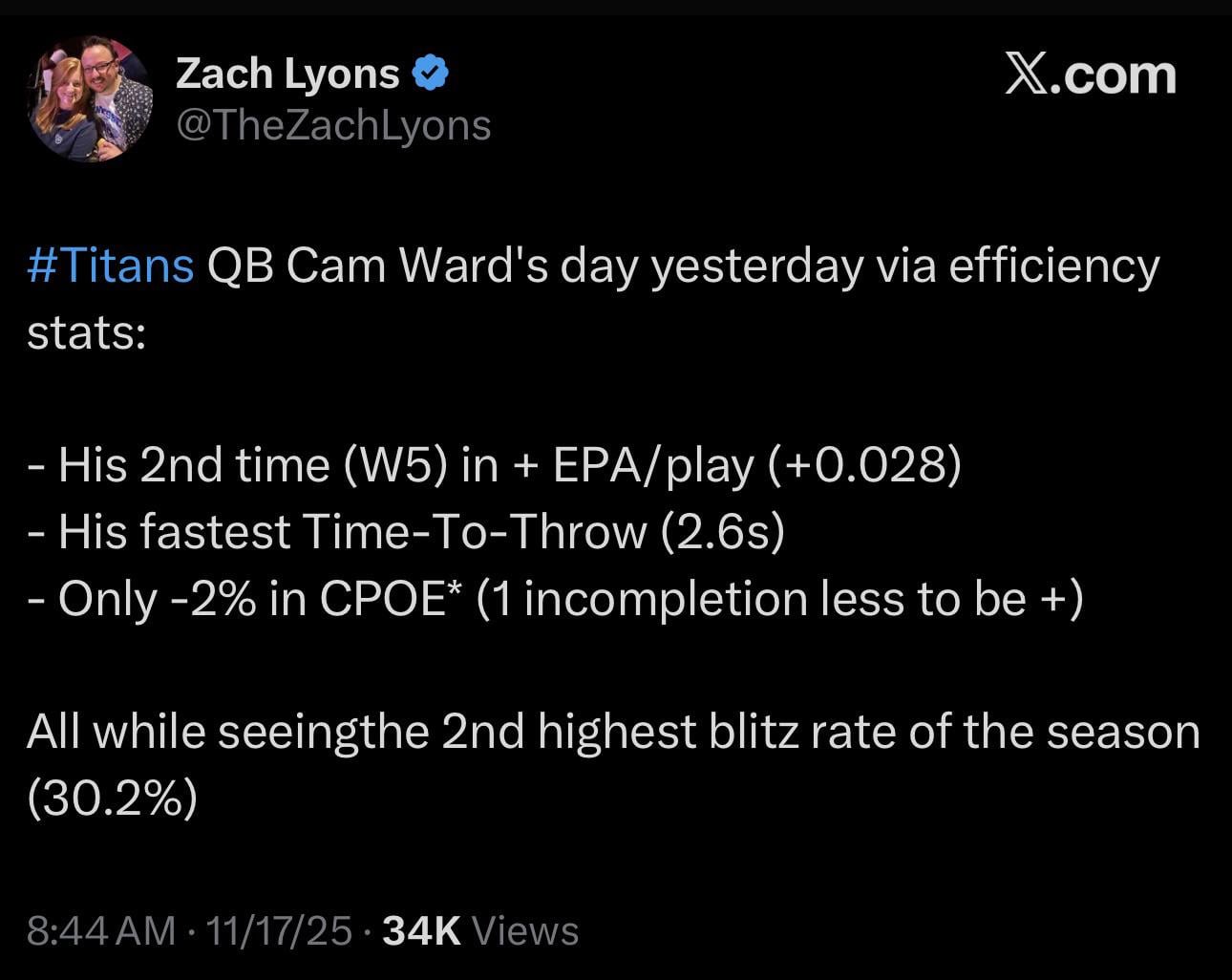This was also with a run game that only averaged 1.8 yards a carry, not counting Wards own scrambles, and throwing to mid round rookies and practice squad guys.