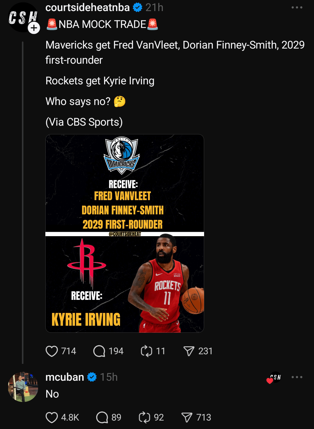 But by the way my hunch is Cuban is saying “no” to this likely as a gesture to generally just support Kyrie. I think the Mavs want to hold on to some semblance of culture/identity and Kyrie is a massive piece of that.