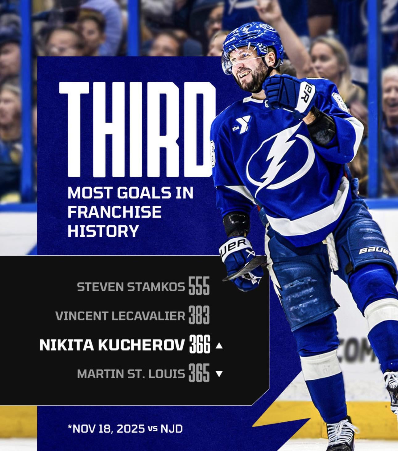 Nikita Kucherov passes Martin St Louis for 3rd most goals in franchise history!