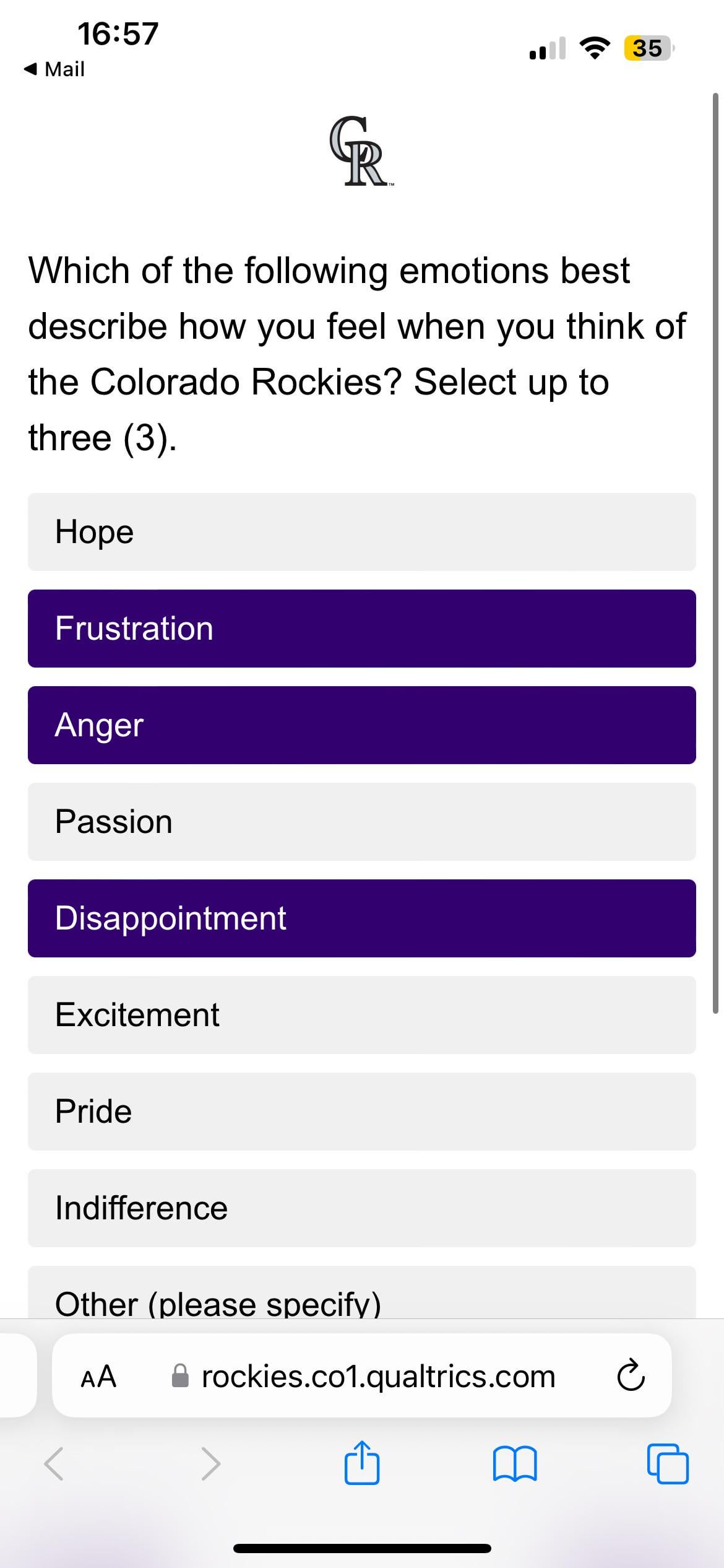 Just got an email where you fill the survey and they give you 4 tickets for free for next season. 4 comments I voted frustration and disappointment. But hey 4 free tickets! Just hope. 4 tickets I picked excitement and indifference which I realize are like basically opposites ha At the end of the survey I wrote “I am raising my kid to be a Rockies fan so that he can learn that in life we are not promised good things” Leave a ReplyYou must be logged in to post a comment.