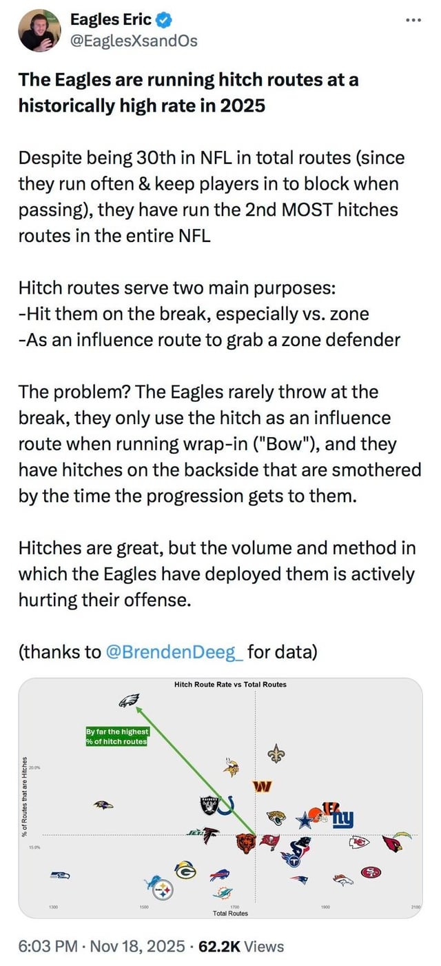 The Eagles are running hitch routes at a historically high rate in 2025.