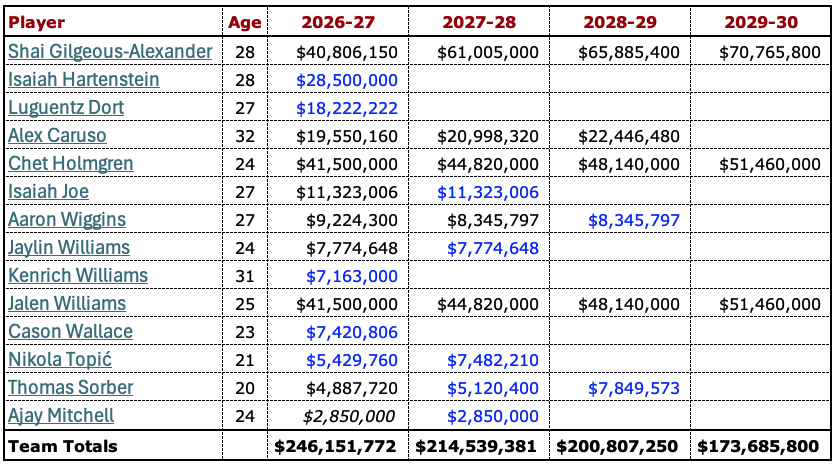The picture shows salaries over the next four seasons from bb-ref with ages adjusted. I've removed all players who aren't on contracts past this season (Ous, Barnhizer, Youngblood & Carlson), but feel free to protect them if you want.