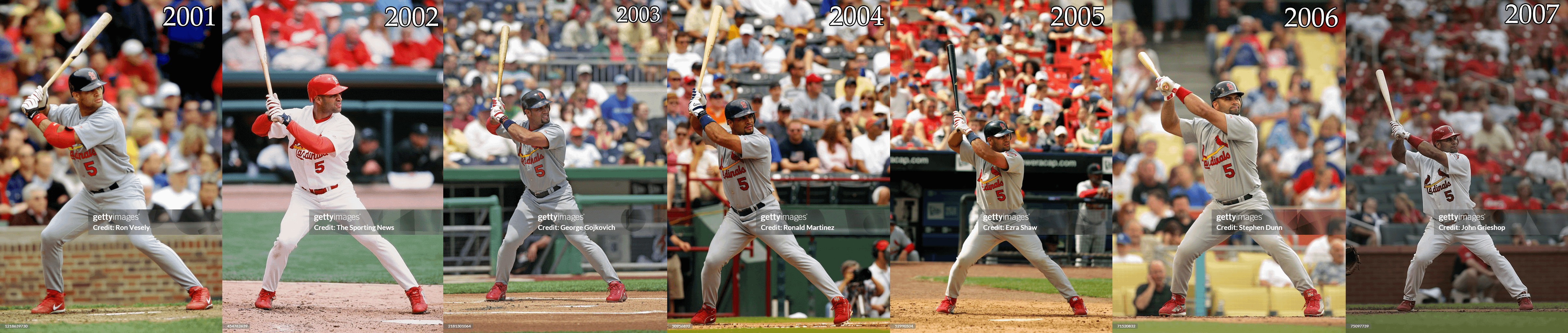 Why did Albert Pujols, from 2001 to 2007, keep raising his bat higher and higher while also crouching lower and lower in his batting stance?
