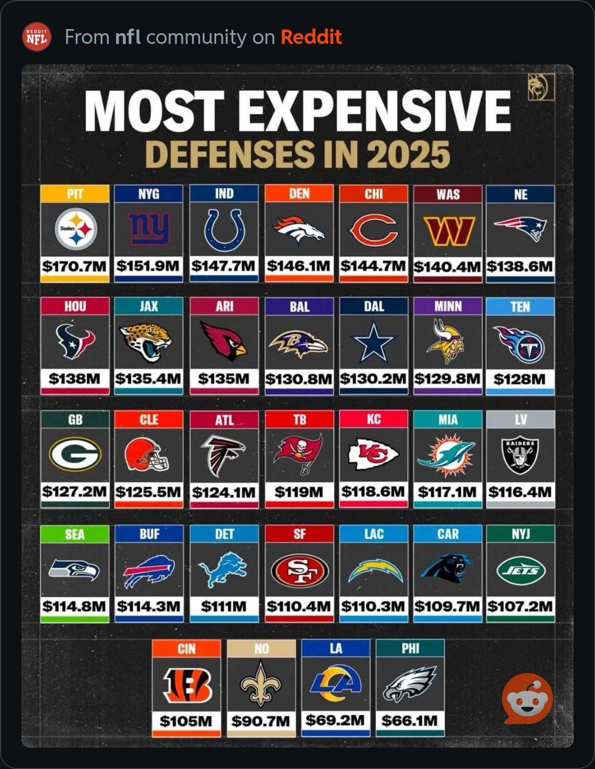 Crazy how Philly’s defense is 40 mil cheaper than Cincinnati’s and we’re one of of the top and they’re one of the worst lol
