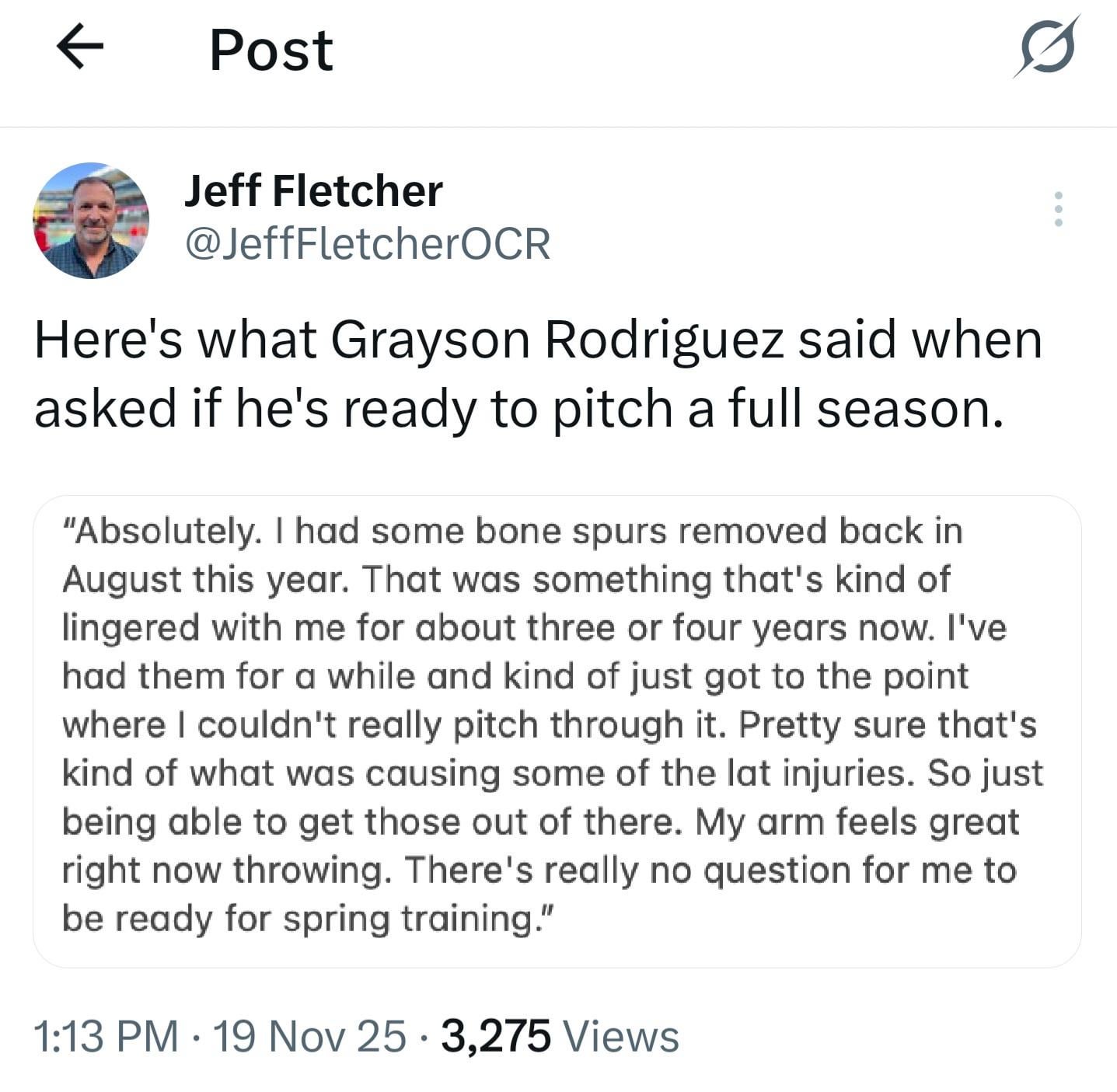 (Fletcher) Update from Grayson Rodriguez. Says he will be ready for spring training