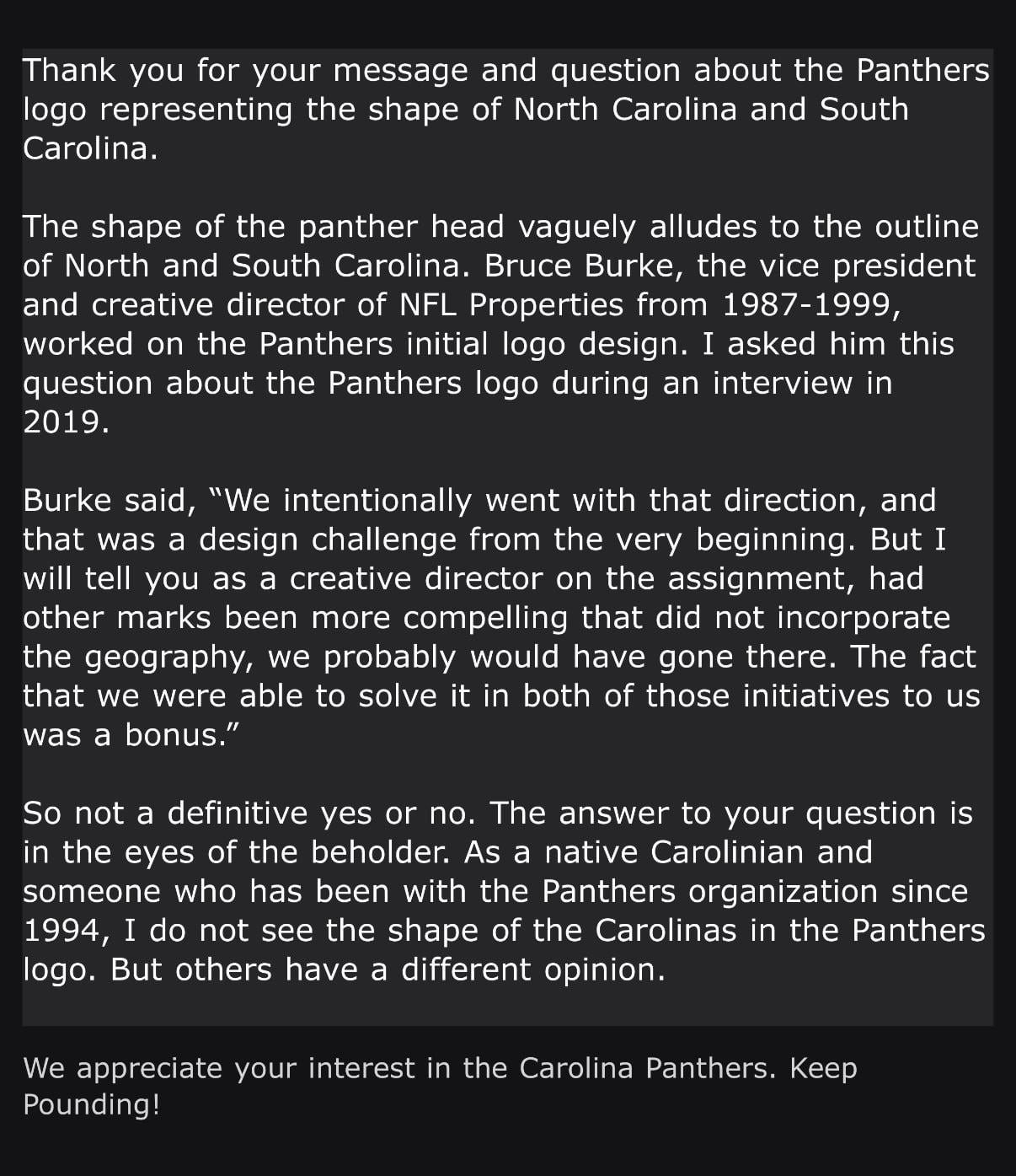 I reached out to the team about the often-repeated claim that the logo is supposed to look like the actual Carolinas, and they got back to me: 5 comments how did you go about reaching out to the team? i want to know why there are no white jerseys in the team store. Cool of them to give such a detailed response This may be my favorite post on this board, ever! Thanks for the info! It’s abstract and is one of those things where you can’t unsee it I have a hat with the two states behind the logo and it sells it to me https://preview.redd.it/oaoe0f5kde2g1.jpeg?width=3024&format=pjpg&auto=webp&s=1141dd5a080342dfd93517431588151dfb3f97d3 Leave a ReplyYou must be logged in to post a comment.