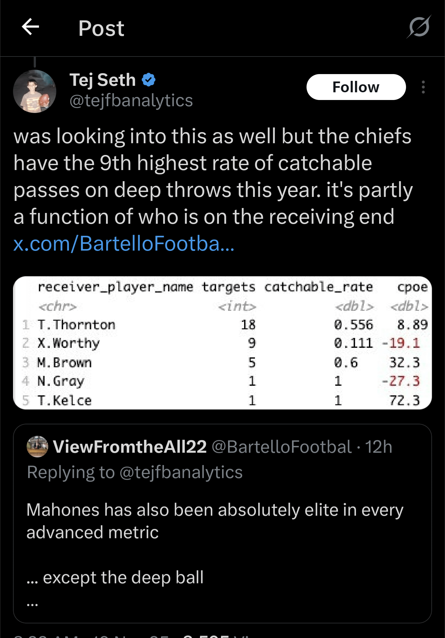 [Tej Seth] Chiefs have the 9th highest rate of catchable deep throws