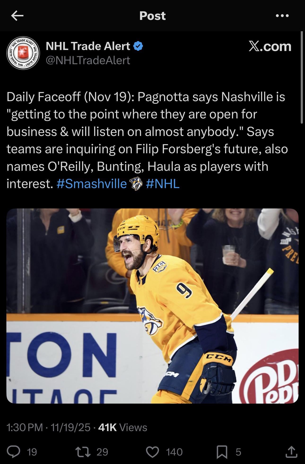 Doesn’t he have a NMC? So it doesn’t matter if he doesn’t ask for it. I prefer to hang onto Forsberg bc I question how helpful it is for our young guys to just play with each other or meh veteran leadership. It would have to be a godfather offer for me