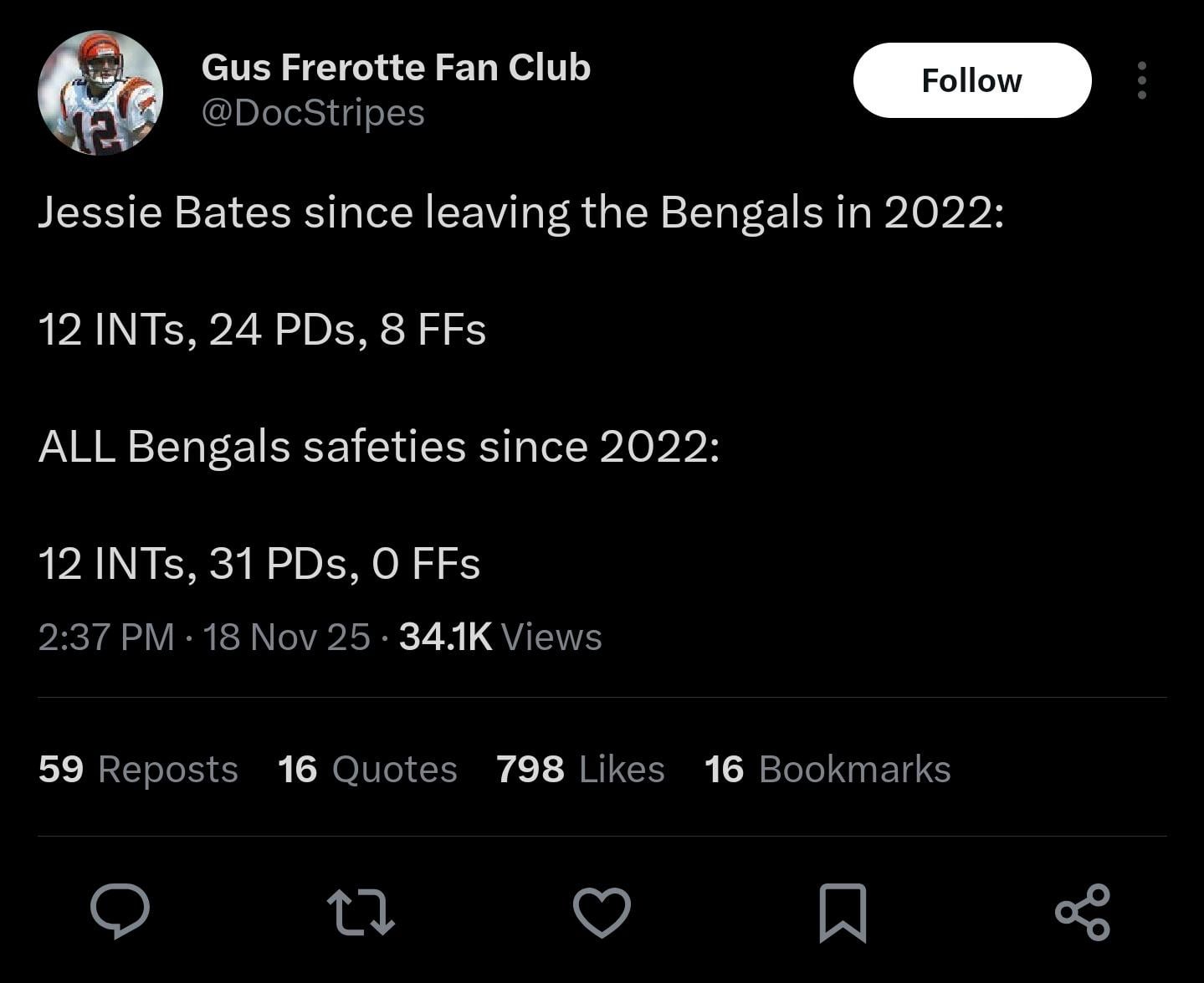 This might not be a popular opinion but acting like Bates walking is what broke the defense is shortsighted. Jessie Bates wasn’t going to save Wilson and Pratt from getting washed, he wasn’t going to develop Murphy or Ossai into good edge rushers, he wasn’t going to prevent Chido getting hurt or CTB regressing to a practice squad player. I loved Bates as much as the next person and I too yearn for the days of our 21/22 defenses, but sticking Bates onto this defense is a bandaid on a severed leg.