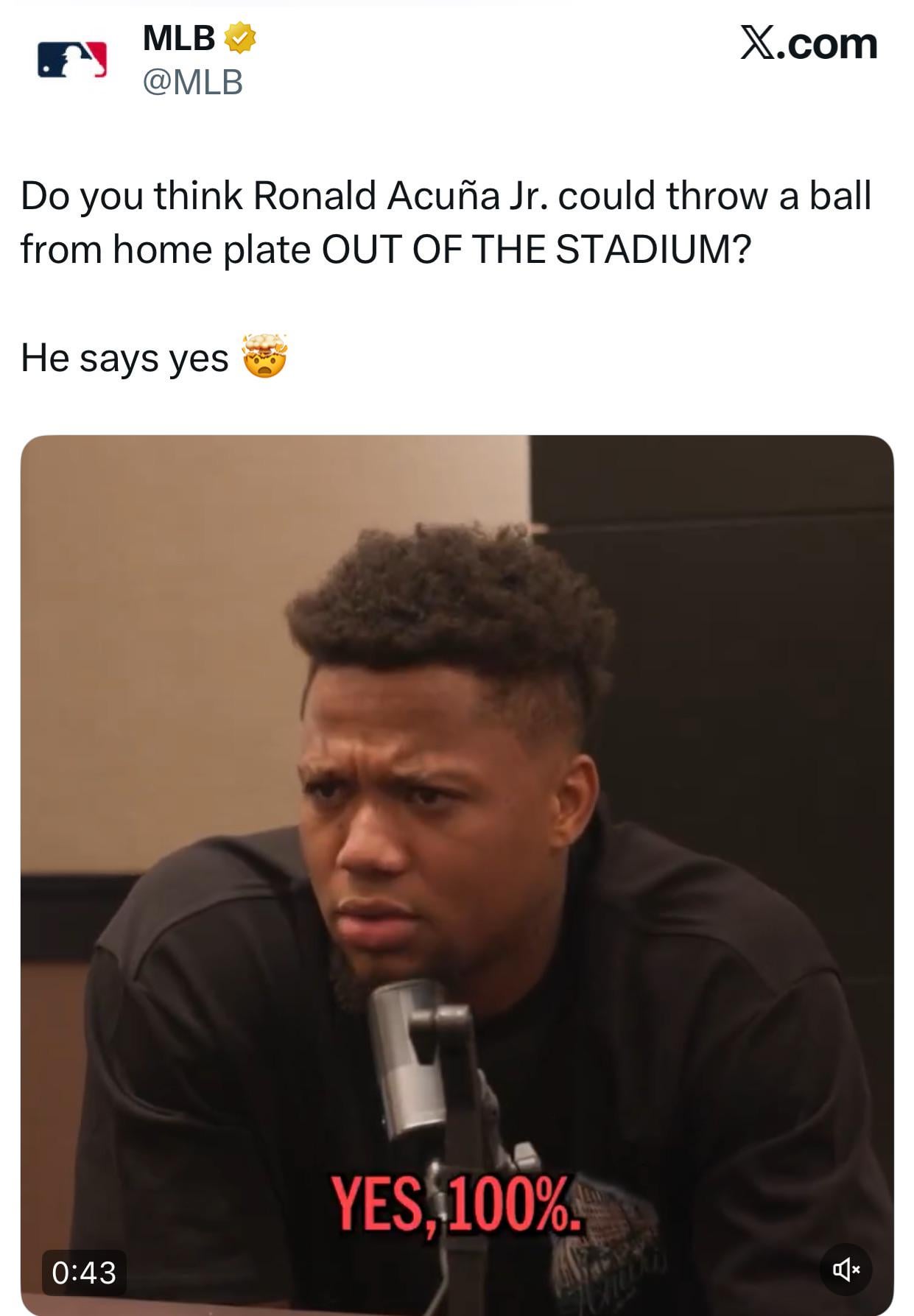 [MLB] Do you think Ronald Acuña Jr. could throw a ball from home plate OUT OF THE STADIUM? He says yes 🤯