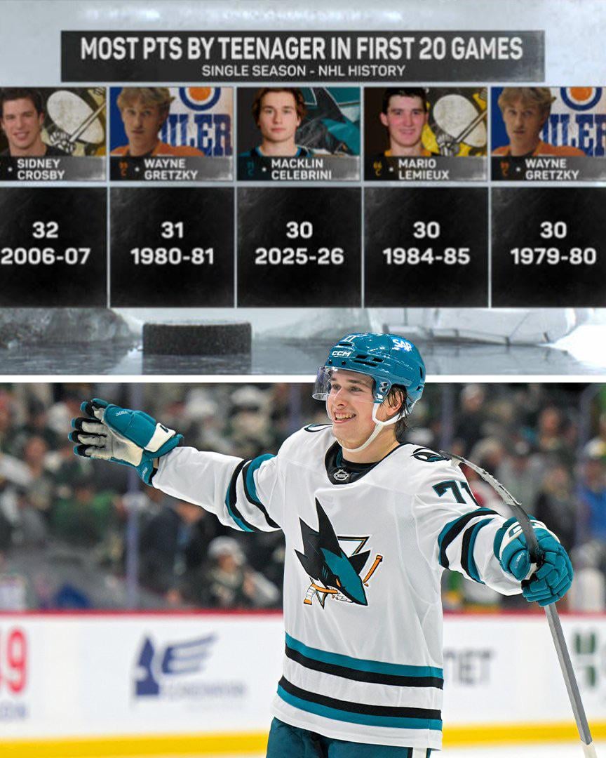 Statement maker at 19 years old 🤯 Macklin Celebrini is ONE OF FOUR different teenagers to record 30 points in the first 20 games of a season in NHL history 👏