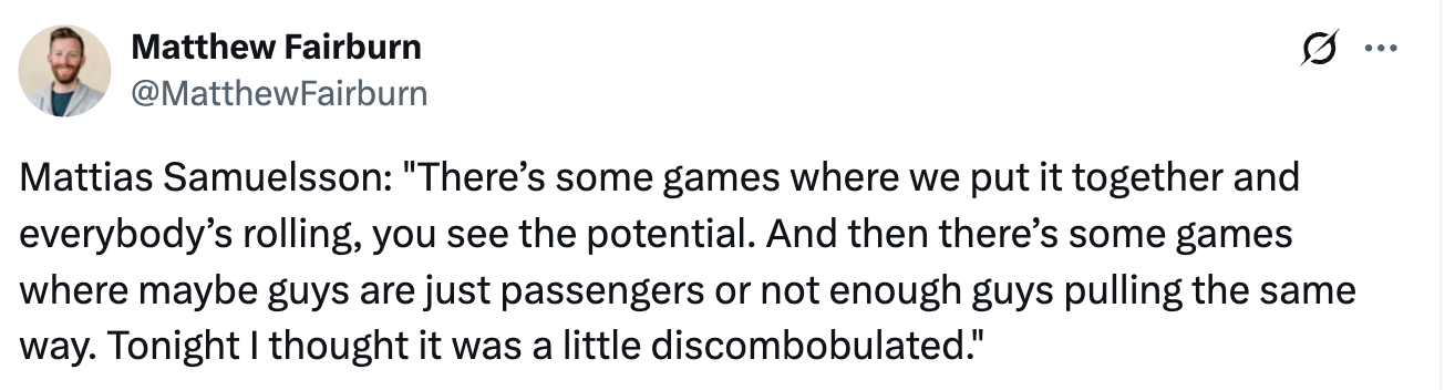 [Matthew Fairburn] Mattias Samuelsson: “There’s some games where we put it together and everybody’s rolling, you see the potential. And then there’s some games where maybe guys are just passengers or not enough guys pulling the same way. Tonight I thought it was a little discombobulated.”