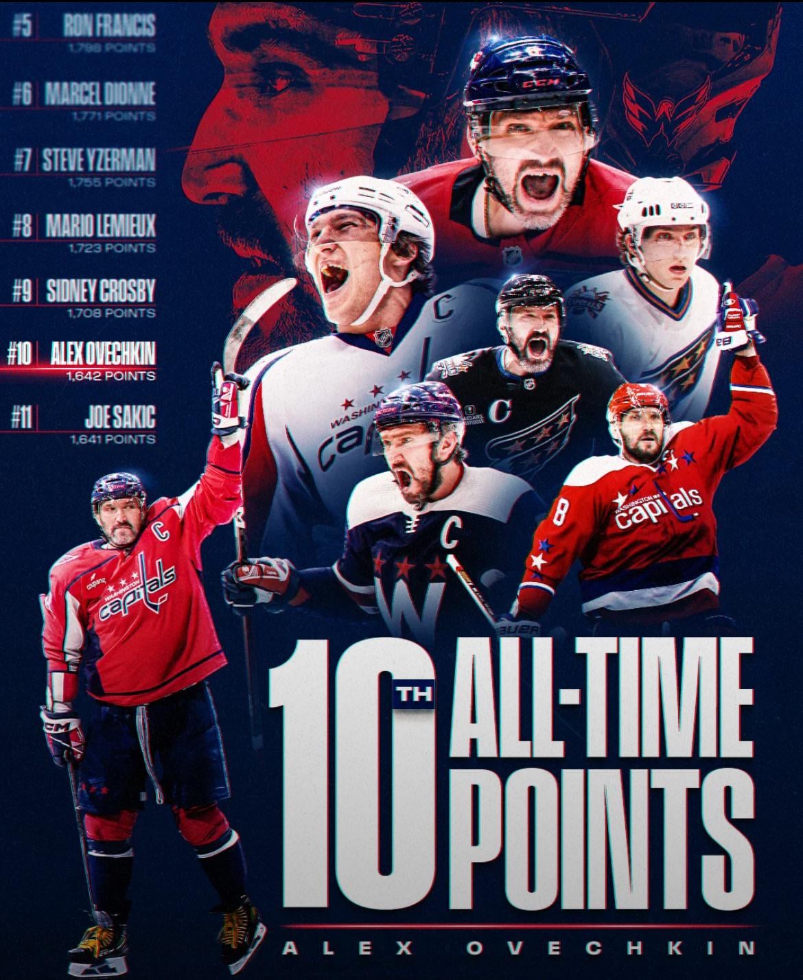 Alex Ovechkin has passed Joe Sakic and is now 10th all-time in points with 1, 642