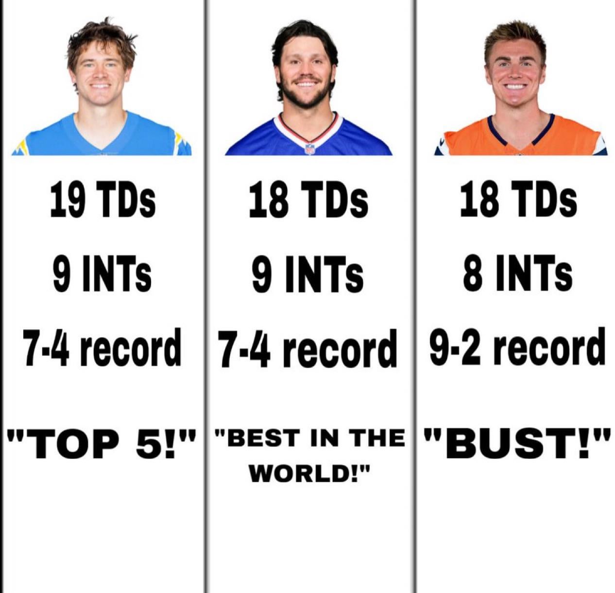 The second you dig below the surface at all, the numbers show Bo being nowhere near these guys levels. Success Rate (how often do your passes keep the offense “on schedule”) Josh Allen 49.3%, Herbert 47.7%, Nix 43.4%. ANY/A (the QB stat with the highest correlation to winning) Allen is at 6.99 while Herbert and Nix are down at 5.97 and 5.88 respectively. I can go on on but Nix is consistently the lowest of the three in any non counting metric while usually you’ll have at least one of the two significantly higher. This is with Nix having the best supporting cast of the group as well considering the Bills defense and recievers suck while Herbert doesn’t have an O-line. With this defense, Nix is good enough to win a lot of games. But let’s not be stupid and compare him to top 10 QBs because he isn’t one at this point in his career