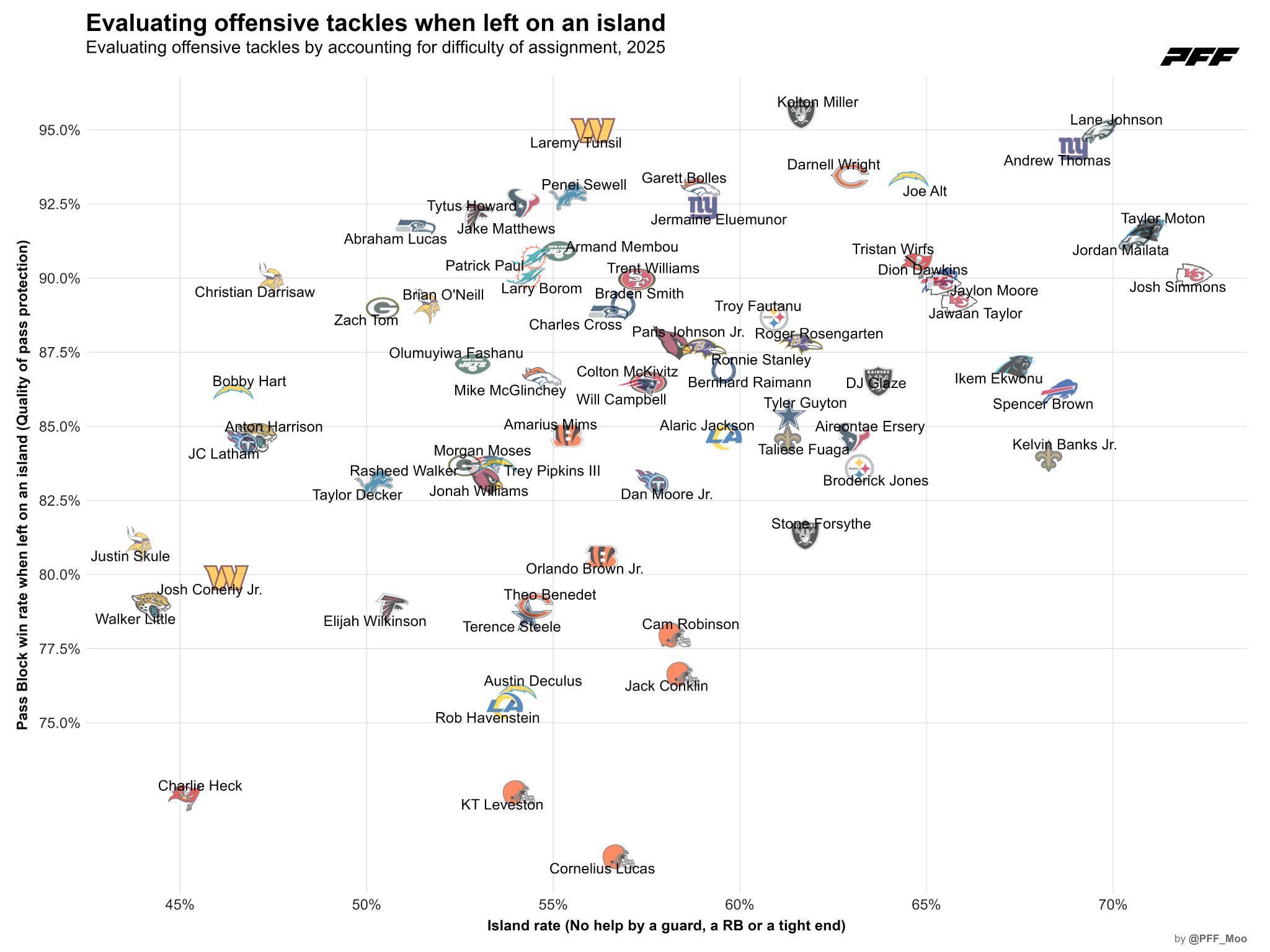 [@PFF_Moo on X] Offensive tackle win rates when left on an island (and how often that happens) 16 comments This may be the least surprising graph I’ve seen all year. still don’t understand why they extended conklin We are paying Lucas, Conklin and Robinson a shit ton of money to be terrible Speaking of islands, there’s “Browns Island” at the bottom of the image. Conklin has played? I figured he spontaneously combusted in practice Flying like the Sprouse goose baby. I see zero reason why we need to draft an OT. I do, however, believe we need to continue to load up on Edge players in the draft. /s My non-Browns take is that Josh Simmons was such an easy evaluation and makes total sense that he’s having success. At some point earlier this season, I called Corn Lucas the worst player in the NFL, and it appears I wasn’t far away from the truth lol I want a receiver in the first round but I’m starting to be more open to tackle Whole offense been bottoming out since AVP left. Stef has to go hands off the offense or out the door. This is the biggest hole on the team. I don’t think it’s particularly close either. No surprise here This next draft just needs to be all offense. Straight up. All the offensive lineman and Wide Receivers available after getting a QB (possibly). Can we trade for one of KCs tackles? Since they’ve got 3 at the top of the graph. How did it get this bad? …oh, right. Leave a ReplyYou must be logged in to post a comment.