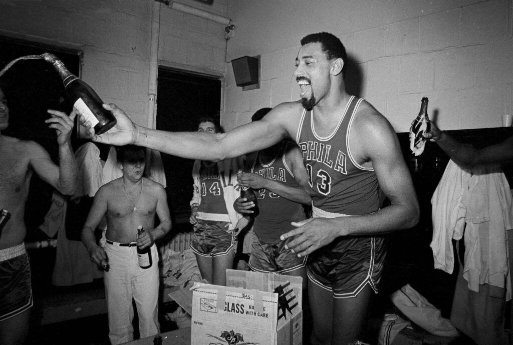 Philadelphia 76ers Wilt Chamberlain passes freshly opened bottle of champagne in dressing room after his team defeated the Boston Celtics 115-113, in overtime, at the Boston Garden, March 9, 1967, to clinch the eastern division title in the NBA. This is the second year in a row that the 76ers have won the division championship. (AP Photo/Frank C. Curtin)