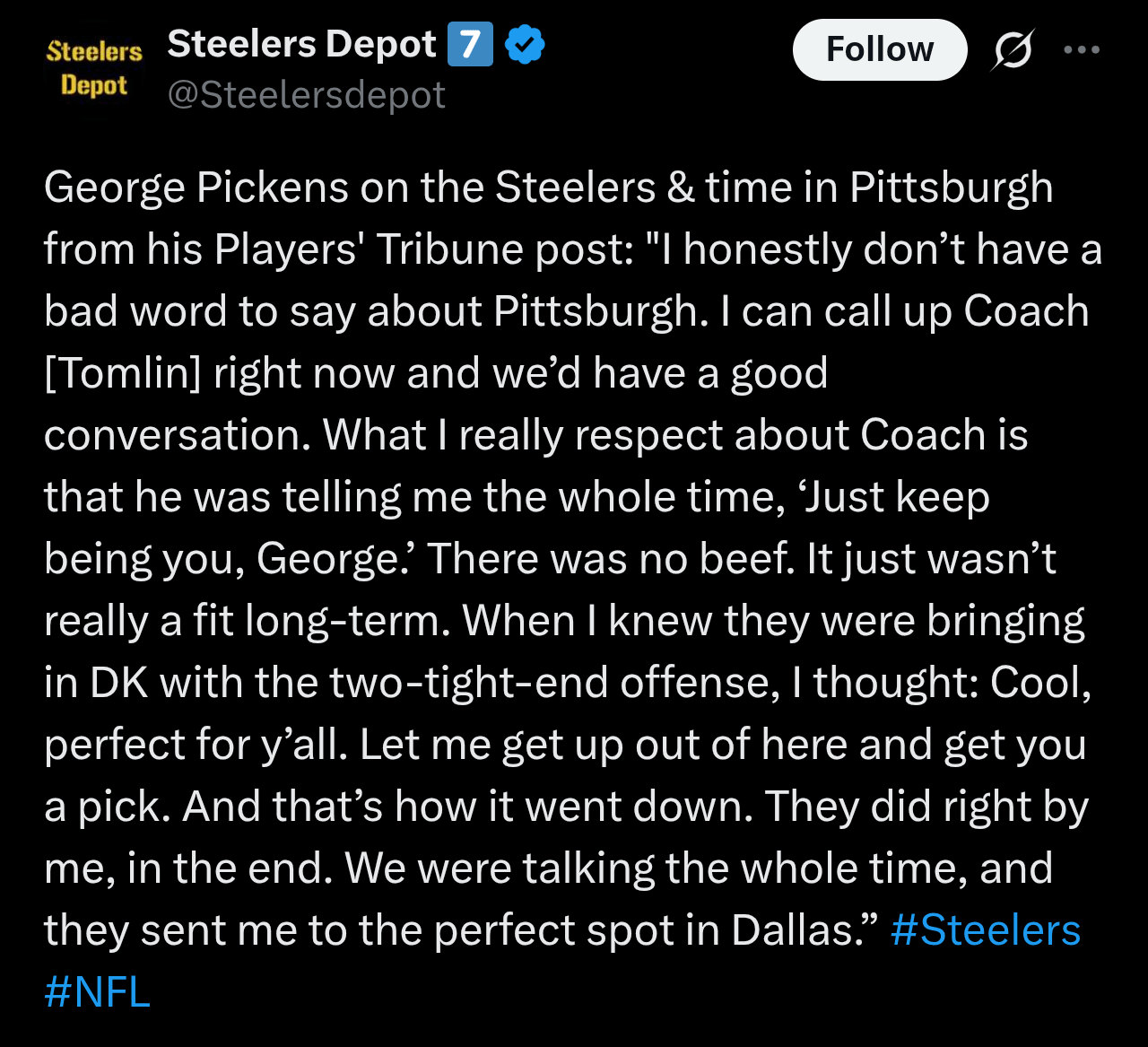 4. all the reporting in Pittsburgh based media is that everyone in the Steelers organization, starting with Tomlin but extending into the locker room, loathes Pickens. the trade certainly wasn’t a good decision from an on-field product perspective, so have to assume there’s a good bit of truth to that.