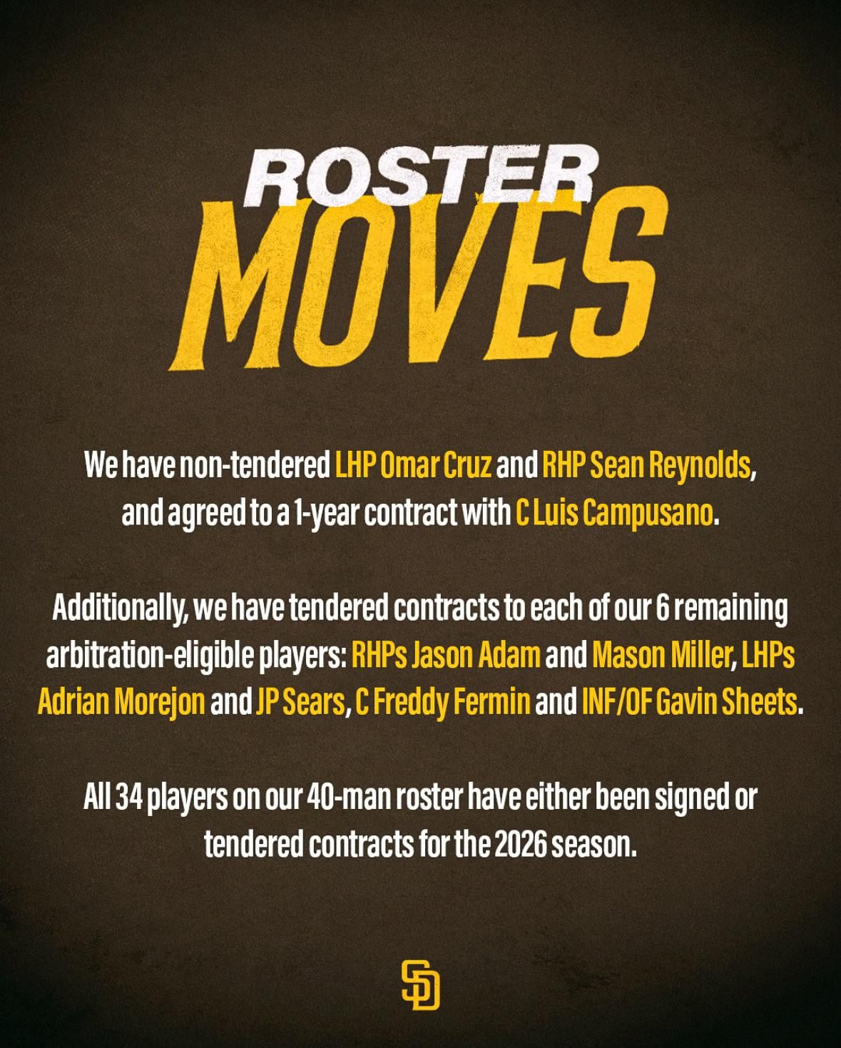 Additionally, we have tendered contracts to each of our 6 remaining arbitration-eligible players: RHPs Jason Adam and Mason Miller, LHPs Adrian Morejon and JP Sears, C Freddy Fermin and INF/OF Gavin Sheets.