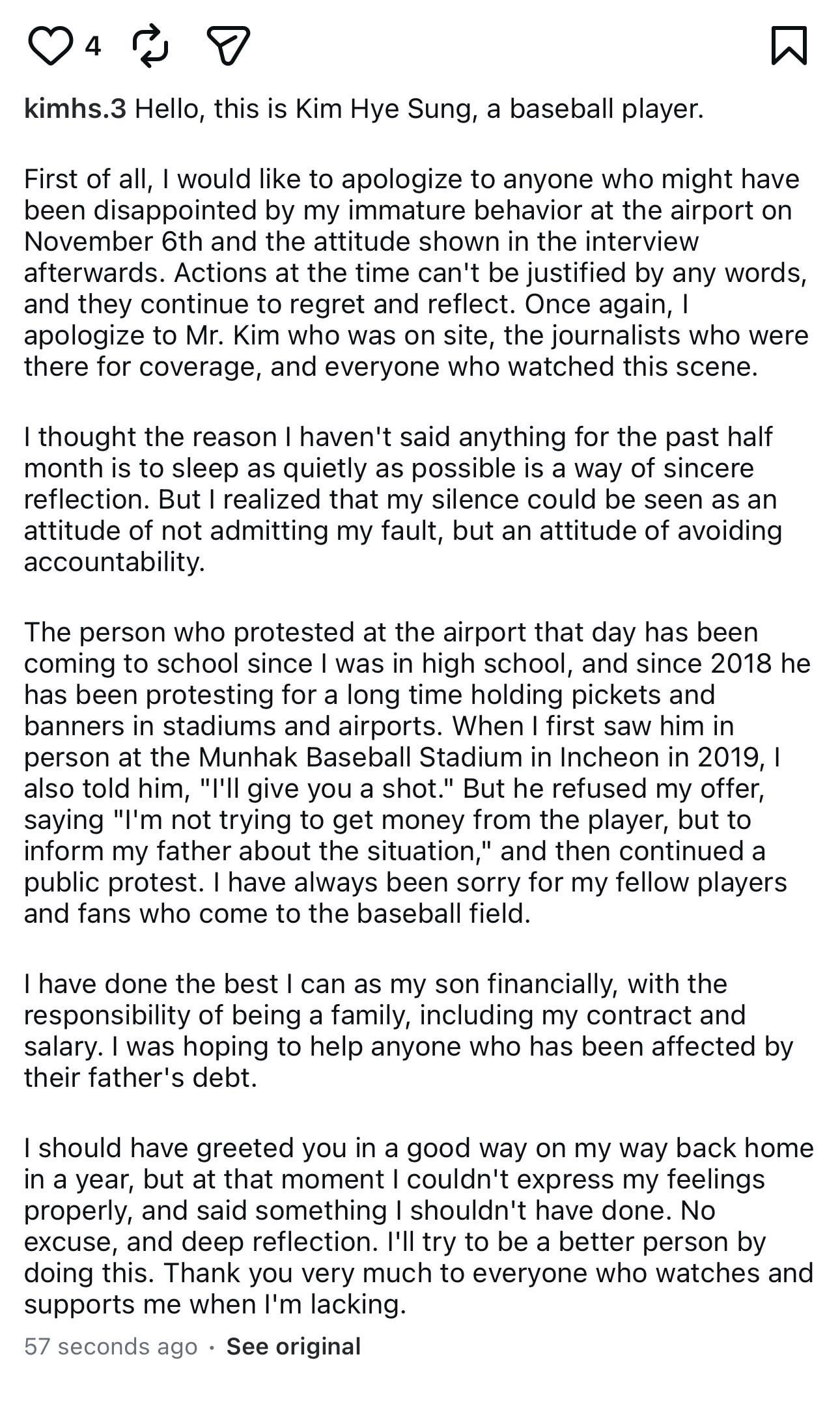 The person who protested at the airport that day had been coming to my school since I was in high school, and from 2018 onward, continued to hold signs and banners at stadiums and airports over a long period of time. When I first met him in person in 2019 at Incheon Munhak Baseball Stadium, I even told him, “I will repay the debt.” But he said he was not trying to receive money from me as a player, but rather to make my father aware of the situation, and he declined my offer. After that, he continued to hold public protests. I always felt deeply sorry, worrying that he might cause trouble for my teammates and for the fans who came to the stadium.