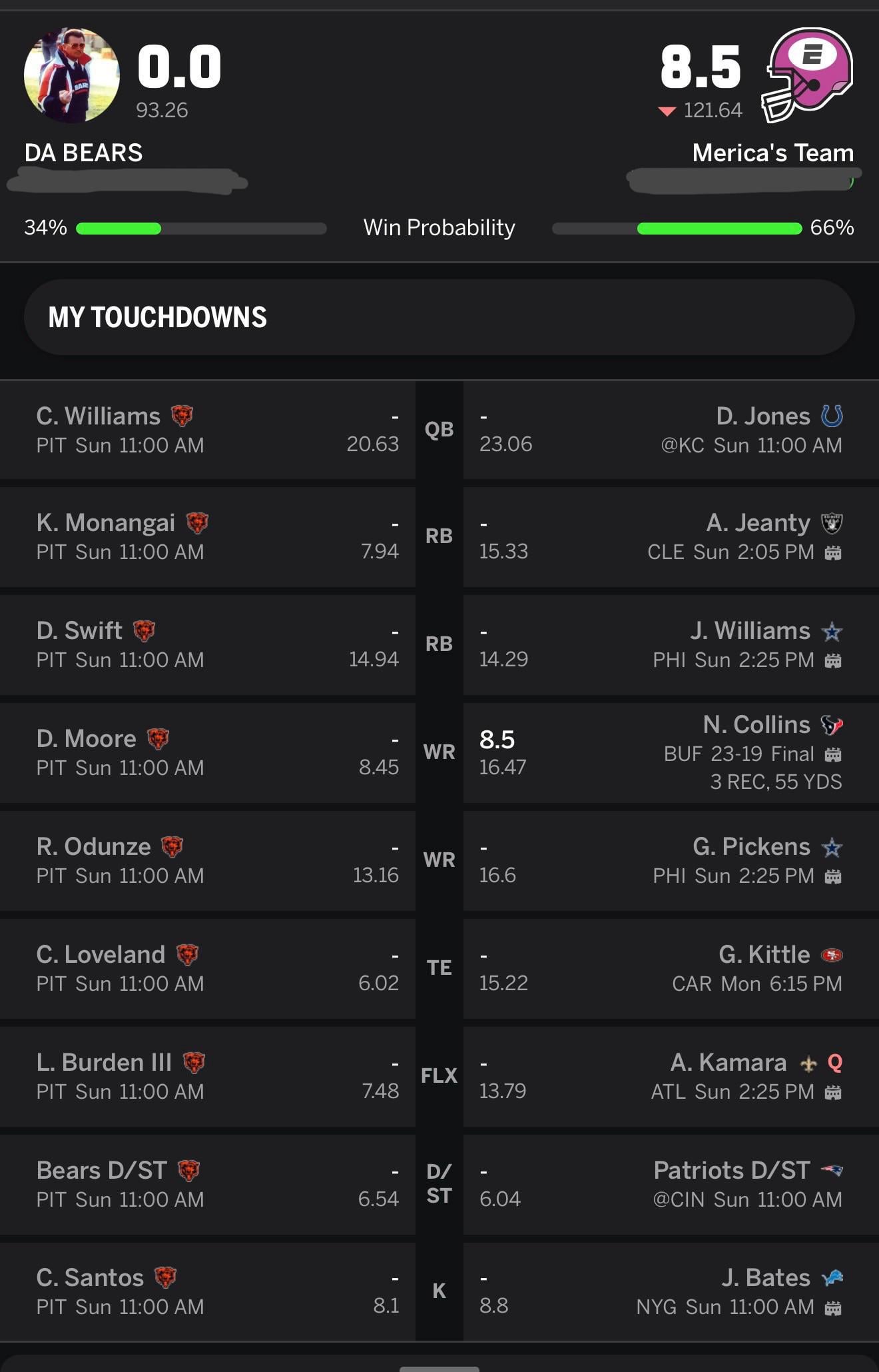 Oh man I thought you were my opponent this week. He also has all bears players. I played him in week 1 and he beat me by 1 point thanks to the last play Caleb did. I figured well if I lose in fantasy as least it will mean the Bears won in reality. Sadly I got the worst of both worlds. Hears to the best of both worlds this week!