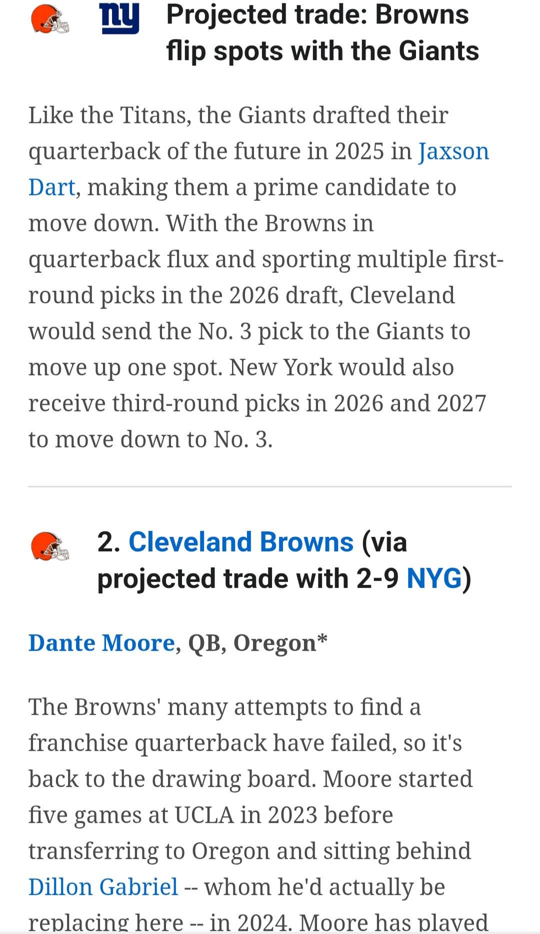 Why would this make sense for the Browns. They’re flipping draft spots with us so they can take a QB, when it flat out says in the analysis that the Giants don’t need a QB. So if we aren’t going to take one, why would the Browns need to get ahead of us?