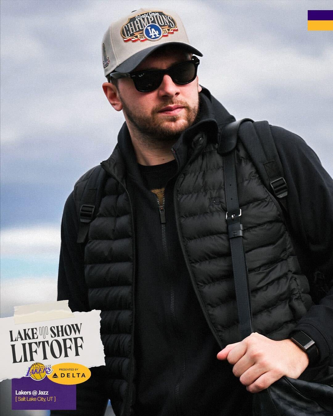 Luka Doncic repping the champs as the Lakers hit the road.