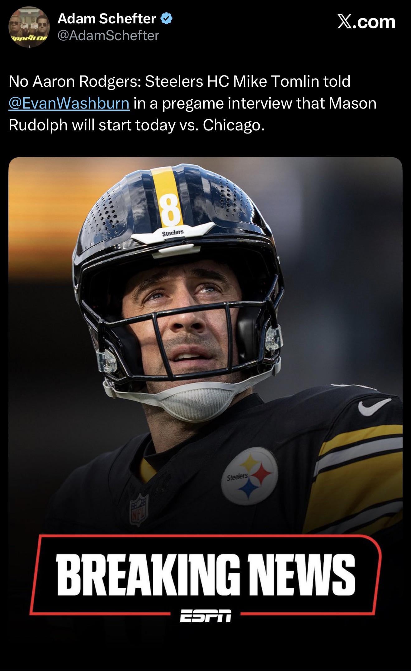 [Schefter] No Aaron Rodgers: Steelers HC Mike Tomlin told @EvanWashburn in a pregame interview that Mason Rudolph will start today vs. Chicago.
