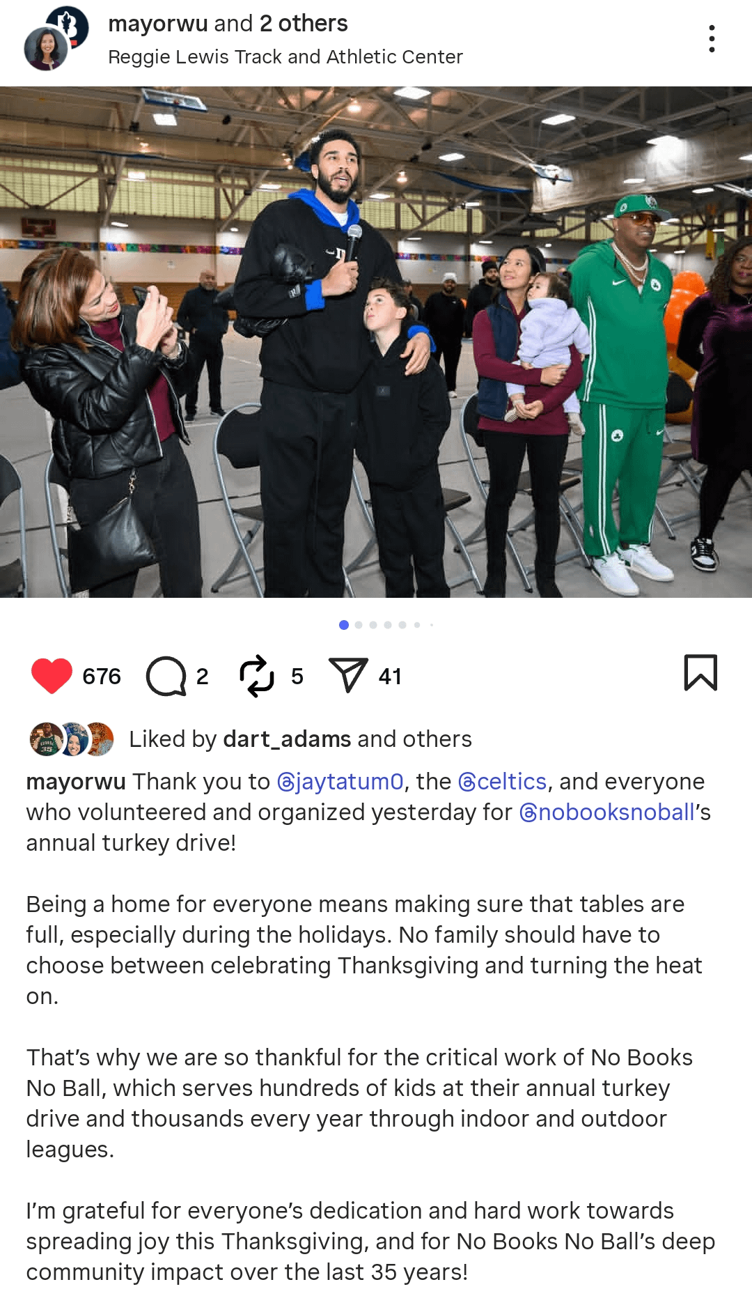 Tatum volunteering at the Reggie Lewis Center for the No Books No Balls annual Thanksgiving drive. Top 5 player and top 5 human 🥹.