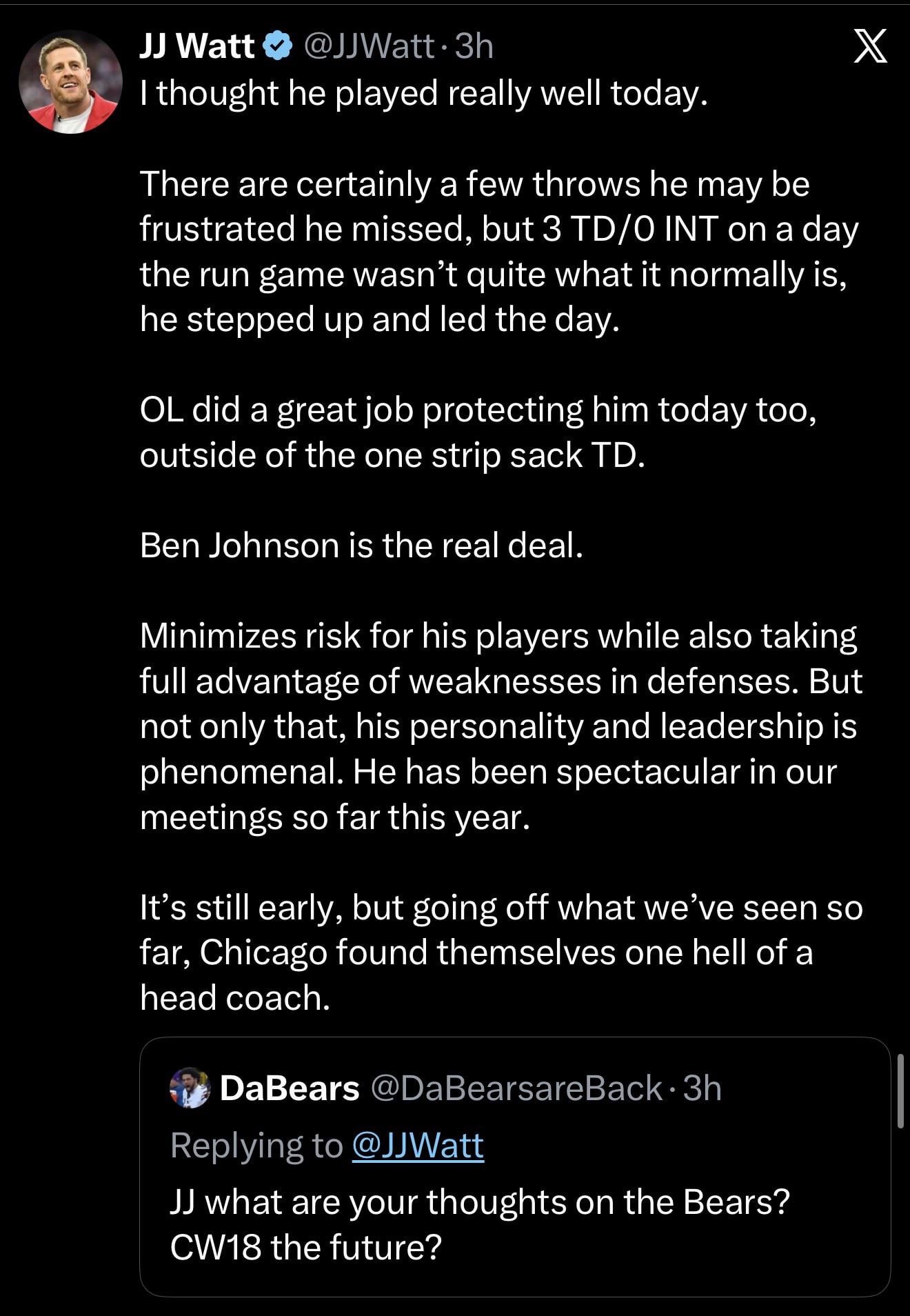 I can’t think of another quarterback who has had to battle narratives as much as Caleb. Maybe Shedeur Sanders? Like is Caleb a fully developed and perfect QB? Obviously not. But I think it’s clear to anybody who seriously watches this team that he’s got what it takes, the question is can he continue to develop in the areas of his game he needs to. The media and general public will never give a Bears QB credit until he’s hoisting a Lombardi and it is undeniable, and even then they might not. A good chunk of our own fans are the same way. This is what developing a QB with potential looks like, it’s not perfect but the progression is there, and frankly the naysayers are just Caleb and or Bears haters at this point