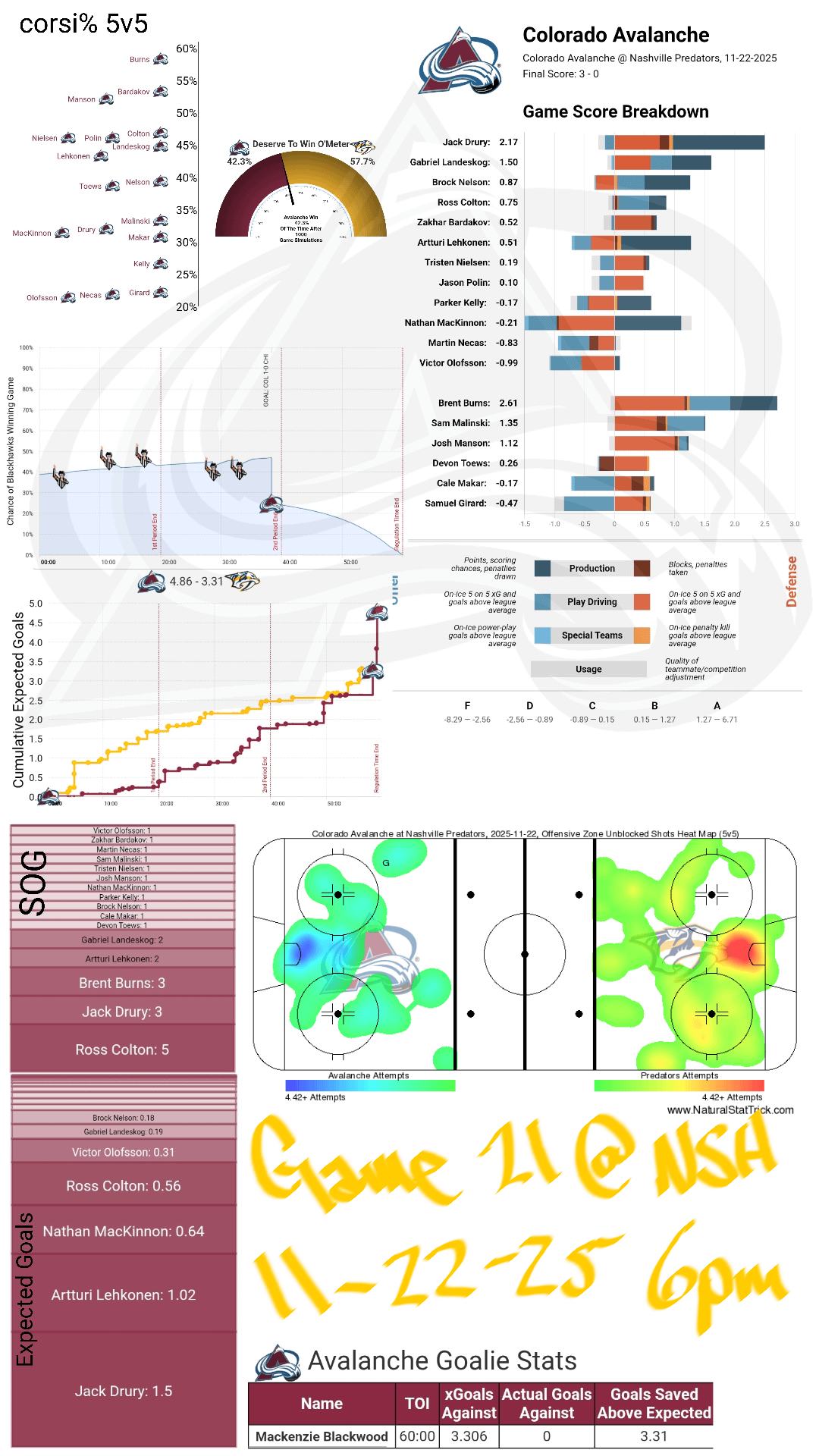 [PPGT] Après Ski | Avs @ Predators | Avs @ Blackhawks | The No Lumberjacks Allowed Edition 10 comments https://preview.redd.it/5i46ntpe783g1.jpeg?width=1170&format=pjpg&auto=webp&s=647d5b4e150df2902021c8ba3d90a622044c872d The best goalie controversy we could ask for Two games where your goalies stole a game. What a difference a year makes. Our 4th line were beasts last night. Thank u Lumberyard 😘😘 Starting to really miss Nuke/Brindley/Kivi/LOC. Significant chunk of the bottom 9 there Graph with goals and penalties is the Blackhawks game on both graphics. https://preview.redd.it/v5q9ybhie83g1.jpeg?width=1170&format=pjpg&auto=webp&s=87b95a7b1df285e76069cfca9039a5e1b3d48deb I’m getting a kick out of this chart I don’t buy the xG chart in Chicago. Basically zero xG for the Hawks in the 3rd? Wedgie definitely made some clutch saves to preserve the shutout. The only question I have is whether this lull we’re in ends before we lose. We’re winning but these wins are very stressful. 5 goals saved above expected in two games is pretty good When the Avs lift the cup those goalie trades will be up there with some of the best trades of all time. We got the best tandem in hockey for 3 picks, 2 players now in the KHL and a backup goalie Leave a ReplyYou must be logged in to post a comment.