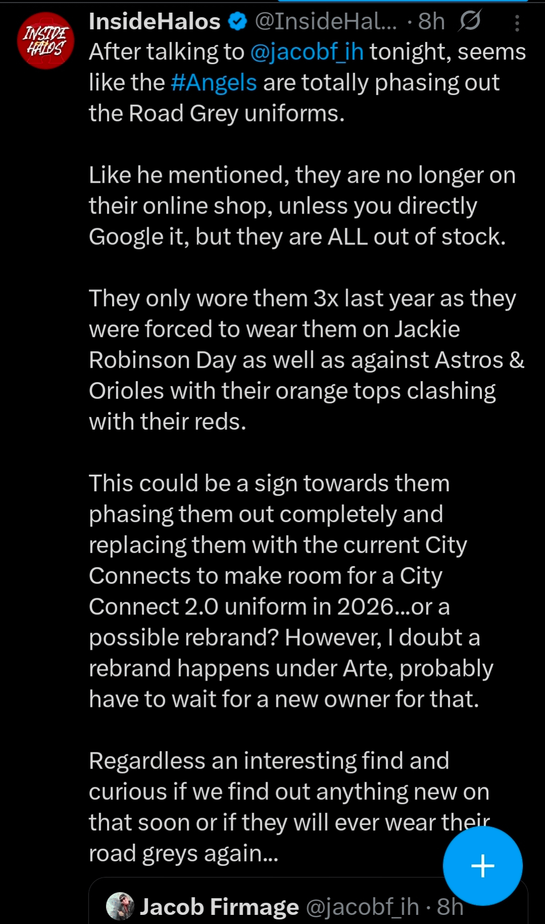 The Angels appear to be phasing out their gray uniforms completely, in order to keep the current CCs, while also bringing in new CCs for 2026. 10 comments I only own one authentic jersey and it’s the gray Mike Trout jersey. The gray is better than the red imo I want a rebrand instead of a City Connect. Id rather get rid of the red jerseys. We badly need new uniforms with more navy blue I’m just happy they’re keeping the current city connects in rotation. Really interested in seeing how the new city connects turn out. Aren’t the city connect jerseys home only? I dont think I’ve seen an away version of those I feel like home whites/cream and road grays should be the standard minimum for every team across the league. Just remove the limit on alternates Great news cc #1 will always be awesome, so glad they are keeping them. Sell the team Maybe I’m not a baseball purist but I’ve never been a fan of grey uniforms. Only a few teams pull it off I want those navy angels unis back. Leave a ReplyYou must be logged in to post a comment.