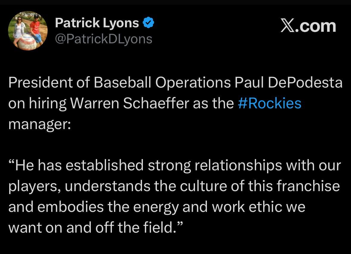 [Lyons] President of Baseball Operations Paul DePodesta on hiring Warren Schaeffer as the #Rockies manager: “He has established strong relationships with our players, understands the culture of this franchise and embodies the energy and work ethic we want on and off the field.”