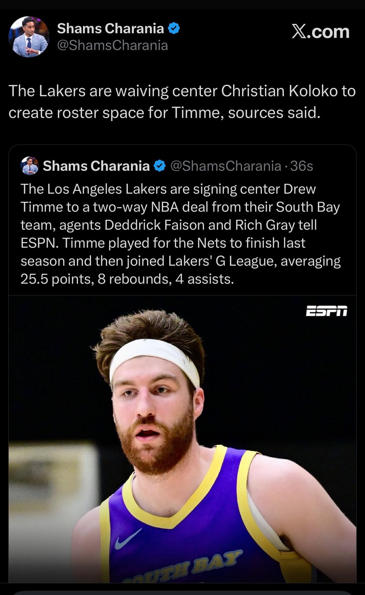 [Charania] Lakers are waiving Center Christian Koloko to create roster space for Drew Timmie, sources said.