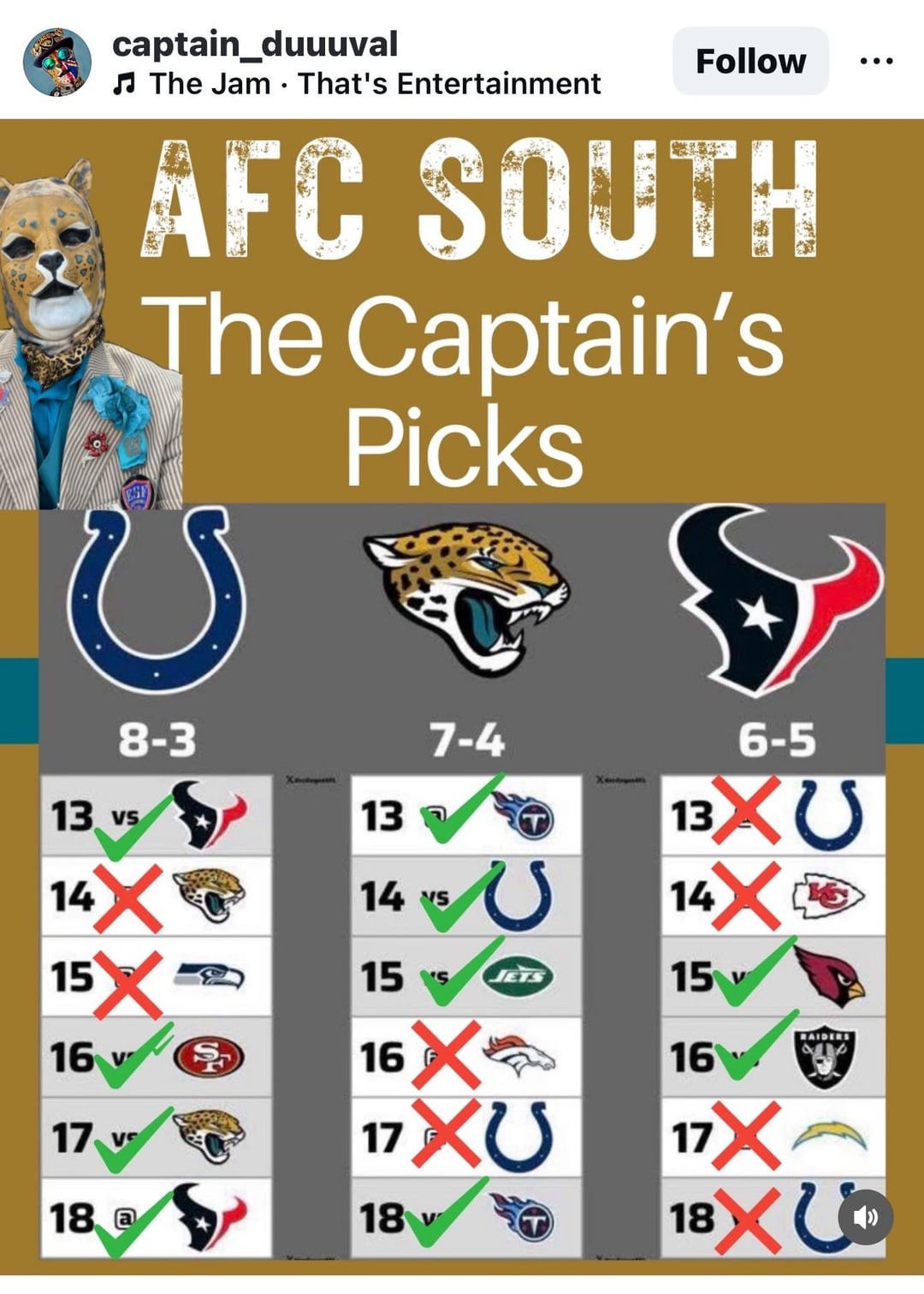 The only thing I agree with is the colts losing in Jacksonville. As is tradition haha.