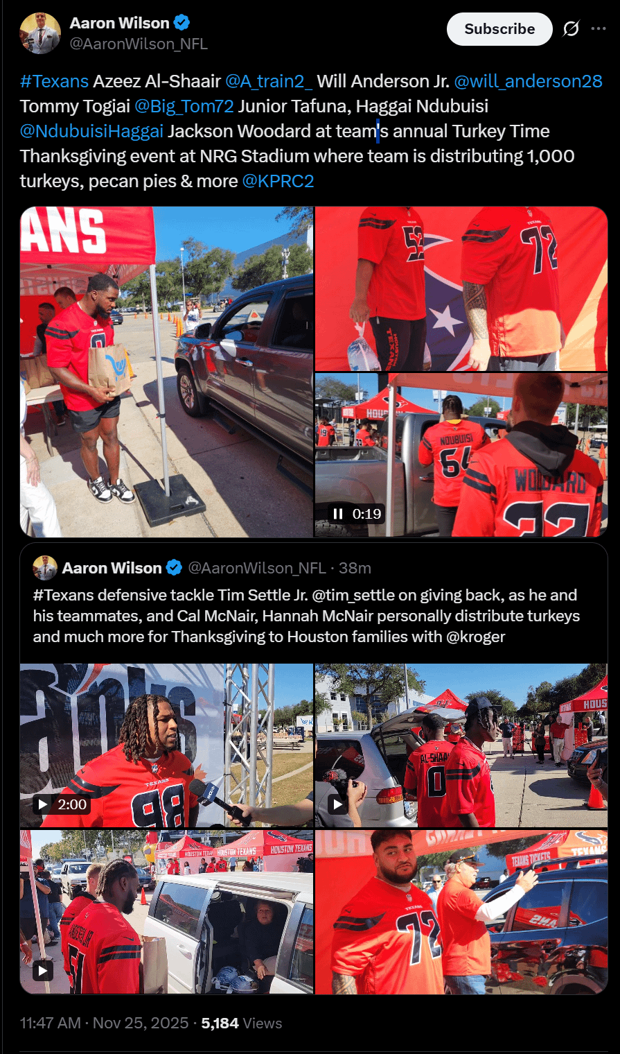 Texans out there giving back to the community this Thanksgiving! 1 comment Link to Aaron Wilson post featured in image. [https://x.com/AaronWilson_NFL/status/1993376062017810584](https://x.com/AaronWilson_NFL/status/1993376062017810584) Leave a ReplyYou must be logged in to post a comment.