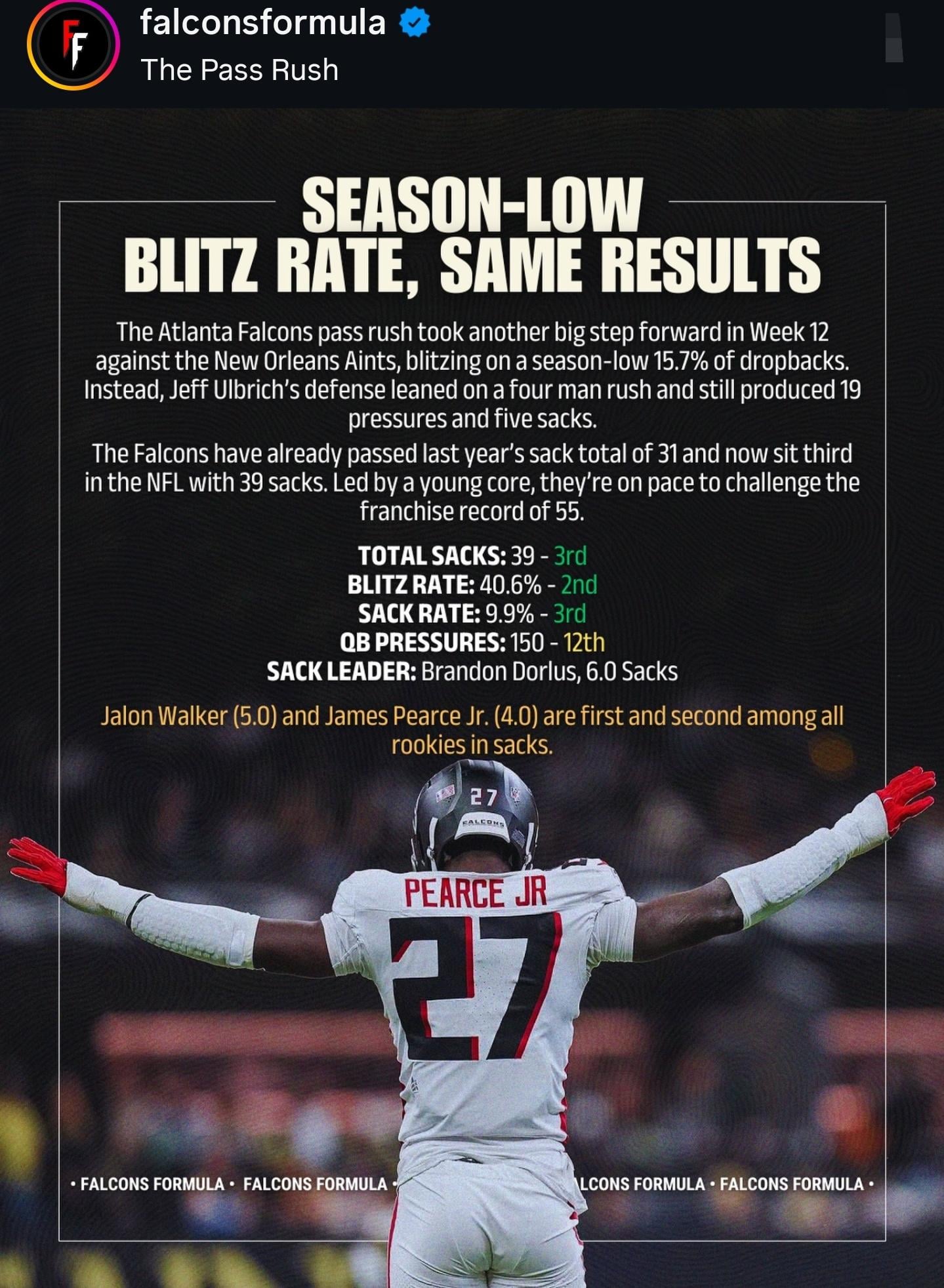 The Atlanta Falcons pass rush is now getting sacks without blitzing. Season-low blitz rate of 15.7% vs the saints with a 44.2% pressure rate.