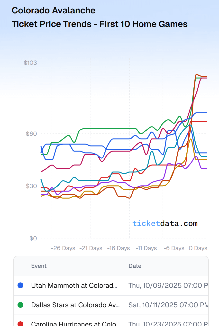 I have been digging through team by team price patterns this season, and the Avs might be the wildest case I have seen so far. For the vast majority of teams (in all sports), resale prices generally drop as the game gets closer. Colorado has been the total opposite.