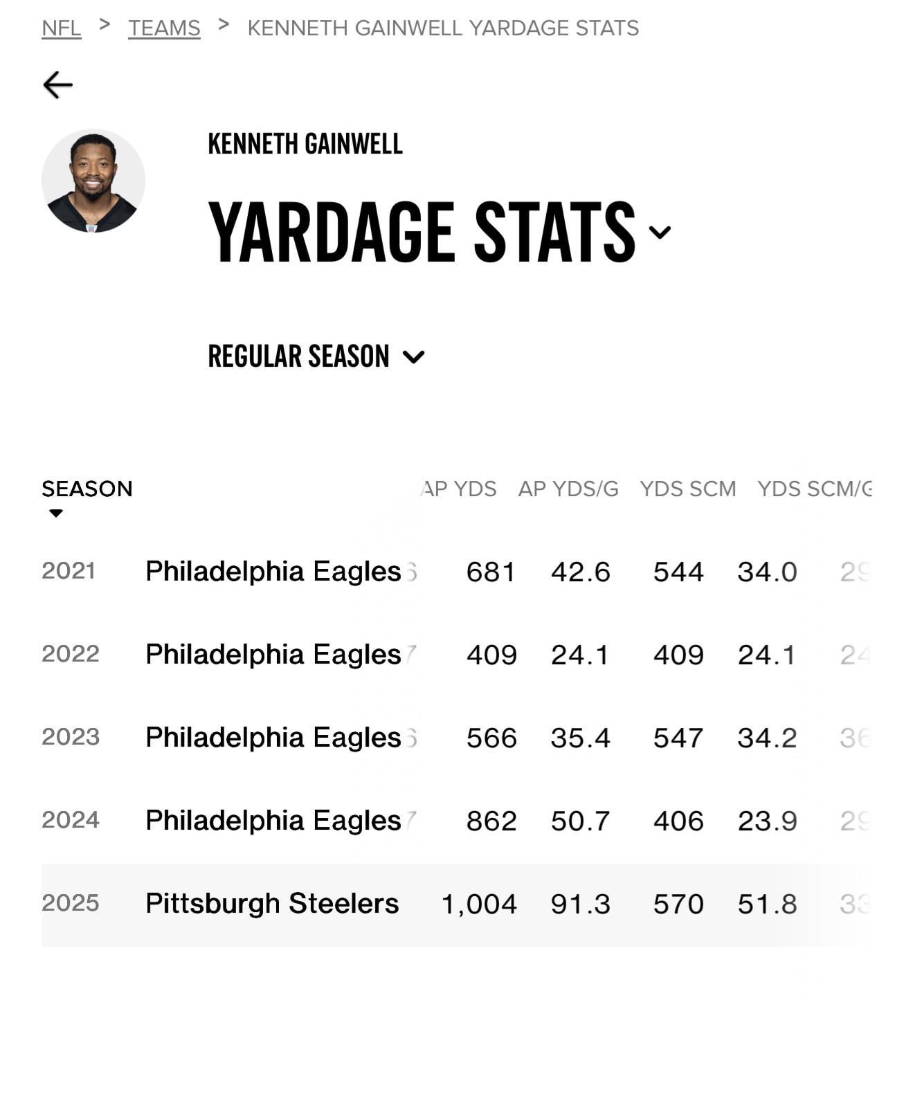 This is not scrimmage yards, this is scrimmage yards plus return yards. It’s such a weird, meaningless stat. Gainwell has been solid but this stat is as meaningless as a third string long snapper