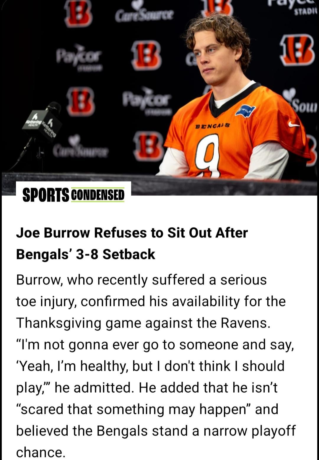 https://sportscondensed.com/news/joe-burrow-refuses-to-sit-out-after-bengals-3-8-setback