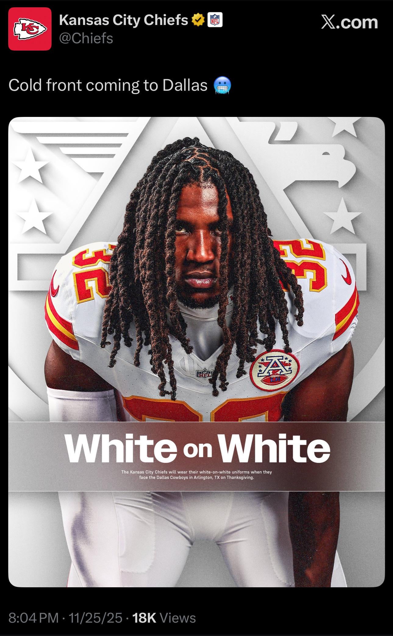 I like the white-on-white uniforms. I also think the Chiefs should come up with a cool alternate for the “rivalries” thing, but I have a feeling they’ll slap Texas on the helmet and call it good. It’s just weird to put some other state on your helmet. But I also don’t want them to update it by just making it Missouri, either. Just…do something original.