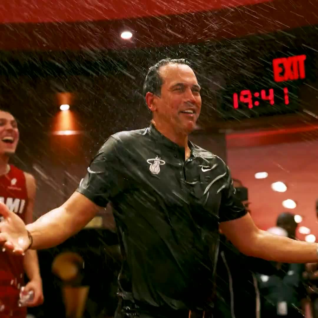 “For what? For what?” — Erik Spoelstra gets showered with water in the locker room and didn’t realize the team was celebrating him winning his 800th game