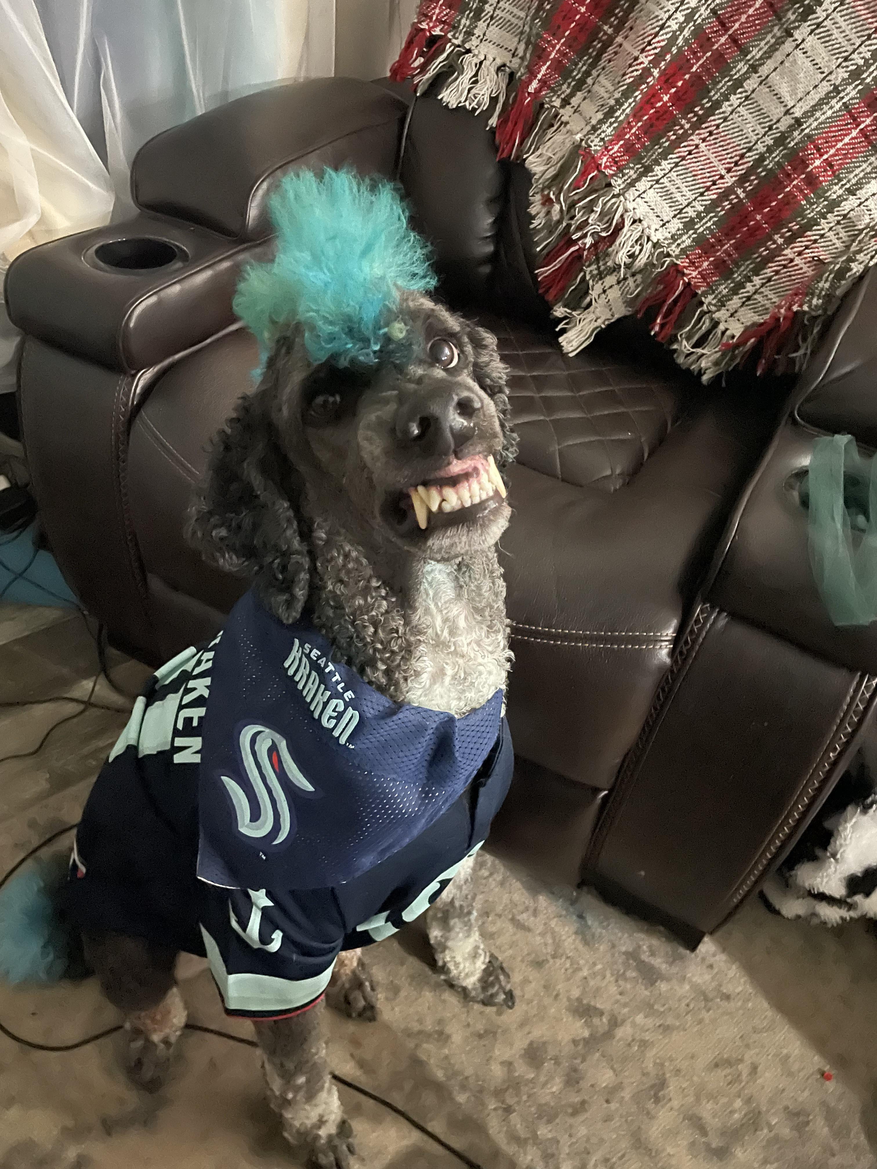 How likely do y’all think I am to nab a puck during warmups if I print a poster of my pup & his Seattle mohawk & gear? 😂
