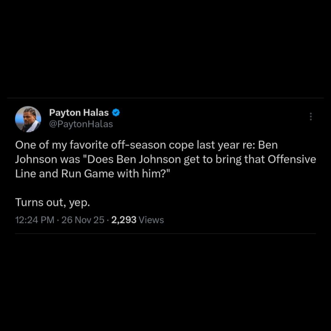 [Payton Halas] One of my favorite off-season cope last year re: Ben Johnson was “Does Ben Johnson get to bring that Offensive Line and Run Game with him?” Turns out, yep.