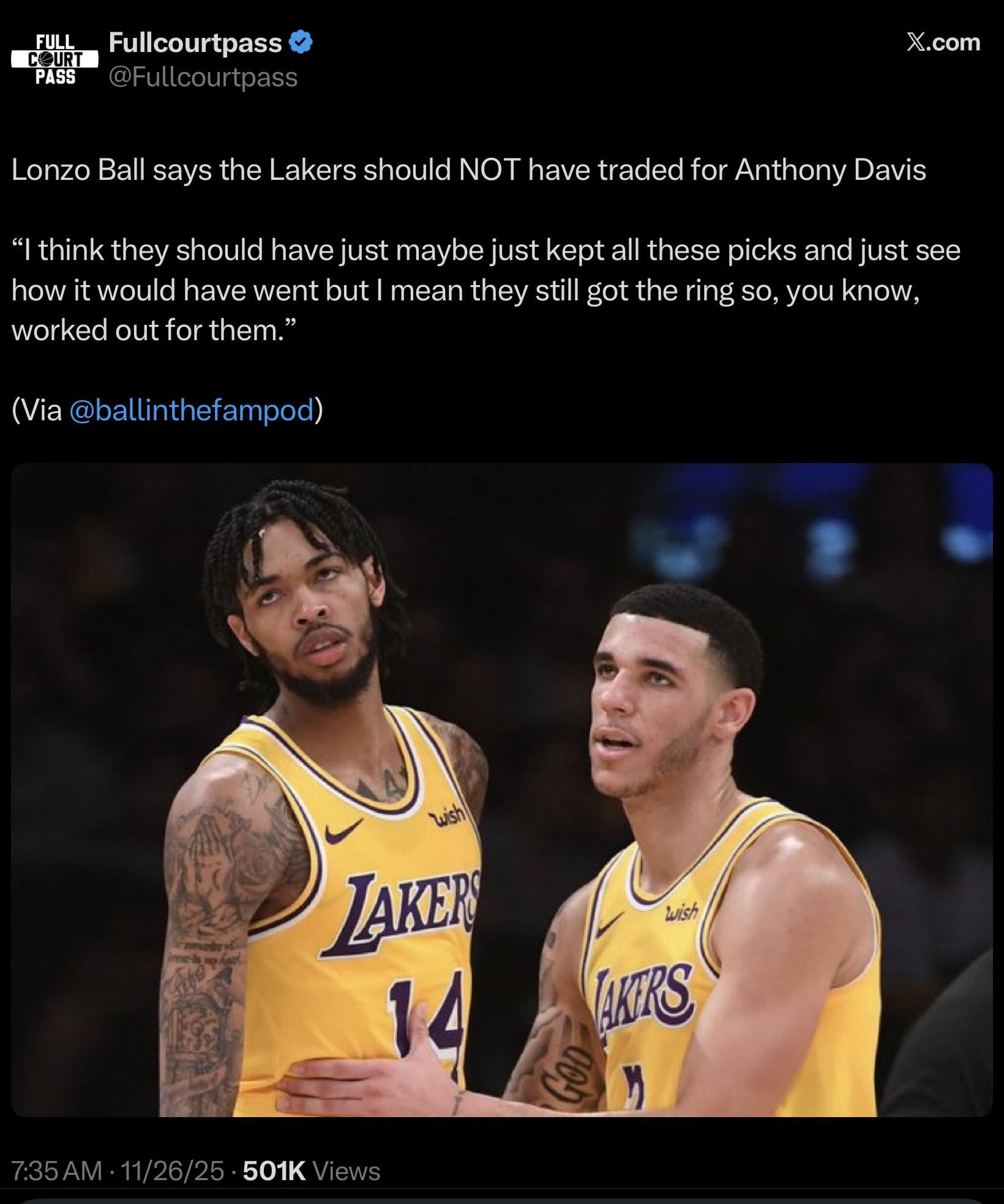 Give me a break. Lakers were not gonna win with even prime and healthy Lonzo, BI, Randall, DRussell, Hart, Zo, Thank you Lebron and AD for the ring! Now excited for Luka!