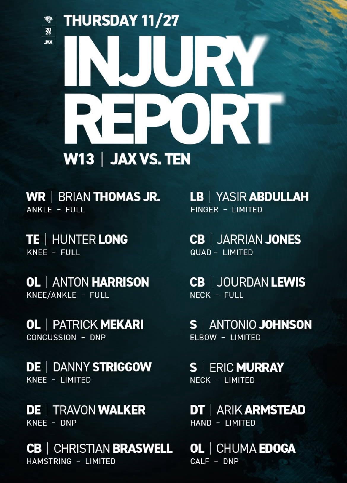Offense is about as healthy it can be going into week 13. Van Lanen at RG might end up being a net positive
