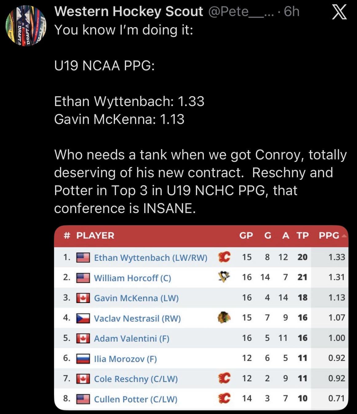 I just wanted to share this from Pete Hughes on X. He has some great amateur scouting content/prospect content. He’s not an anti-tank guy per se-I don’t think he has a dog in this fight as he doesn’t seem to be a primary Flames fan. I think his reason for saying we don’t need to tank, is just to emphasize how well he believes the drafting is. I am personally all foreboding out this year, and the chips fall where they may.