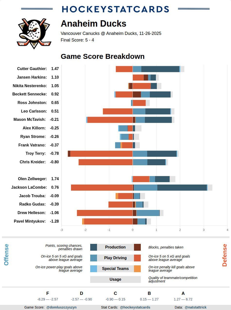 [HockeyStatCards] 2025-11-26 GameScore Impact Card vs Vancouver 4 comments Zelle has been so good this year They almost had 6 xG in that game so the card is a little surprising Hmmm, seems to be missing the own goal stats Harkins doesn’t add up Leave a ReplyYou must be logged in to post a comment.