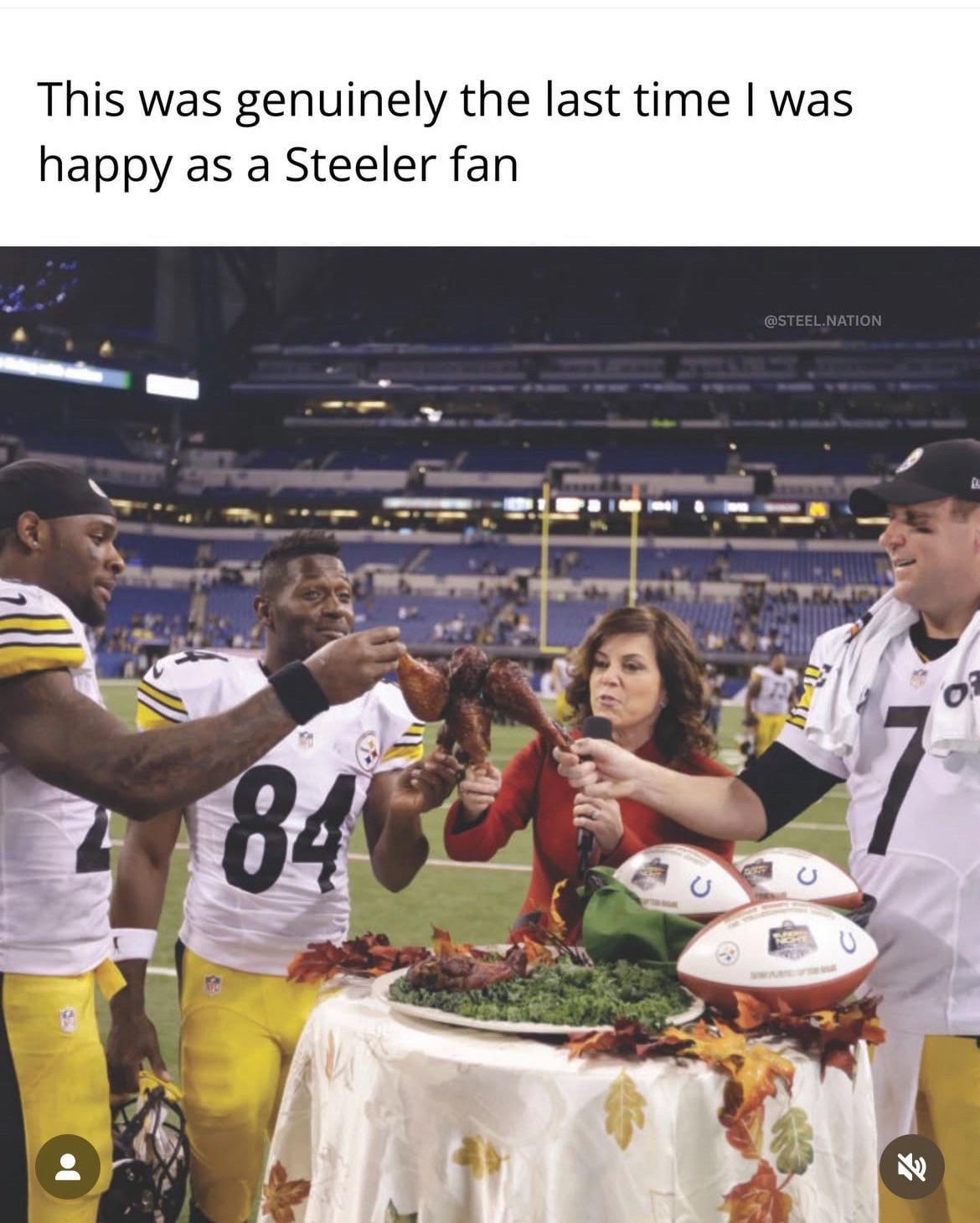 Happier Times In Pittsburgh 8 comments I tried to unmute this  idk i was pretty happy 11/2 I swear, y’all can’t wait for us to be the bottom of the AFCN because “at least it won’t be mediocrity” in your minds. Yeah, but we’re still in first place where the Standard is the standard. If fully healthy They should have won at least 3 to 4 Super Bowls 🥲  Leveon Bell faking liking the turkey is an all timer. Leave a ReplyYou must be logged in to post a comment.